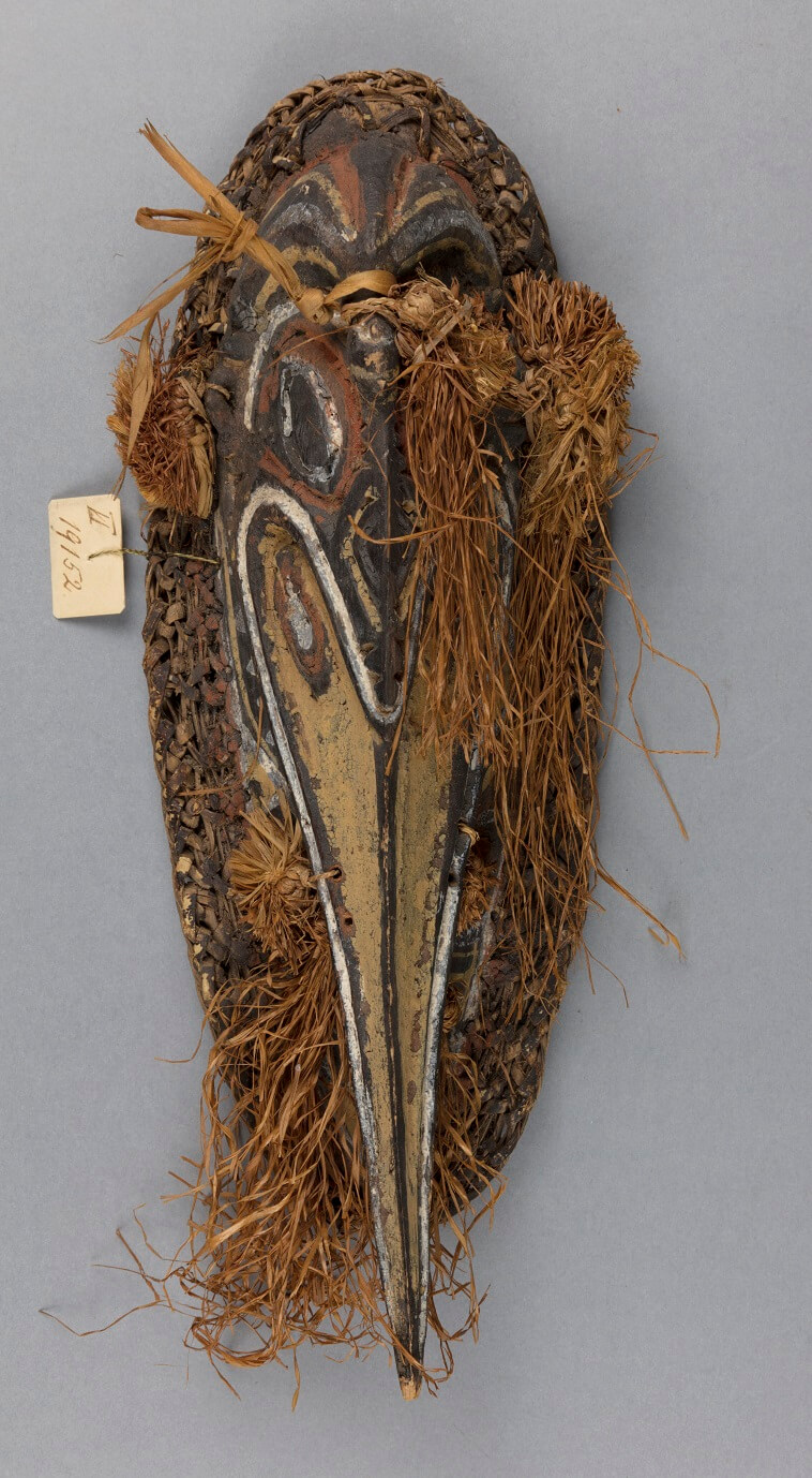 | 扩展说明 | Länglich-ovale Holzmaske in weißer, roter und gelber Bemalung. Büschelförmiger Kokosbast-Behang an der Stirn, an beiden Ohren, beidseits des Septums und in 2 von 4 Löchern, mit denen die Nase durchbohrt ist. Ein geflochtener Rand umgibt die Maske. Hervorstechendstes Merkmal ist die vogelschnabelförmige Nase ("Schnabelstil"), die fast das ganze Gesicht bedeckt und noch über den unteren Nasenrand ragt. |