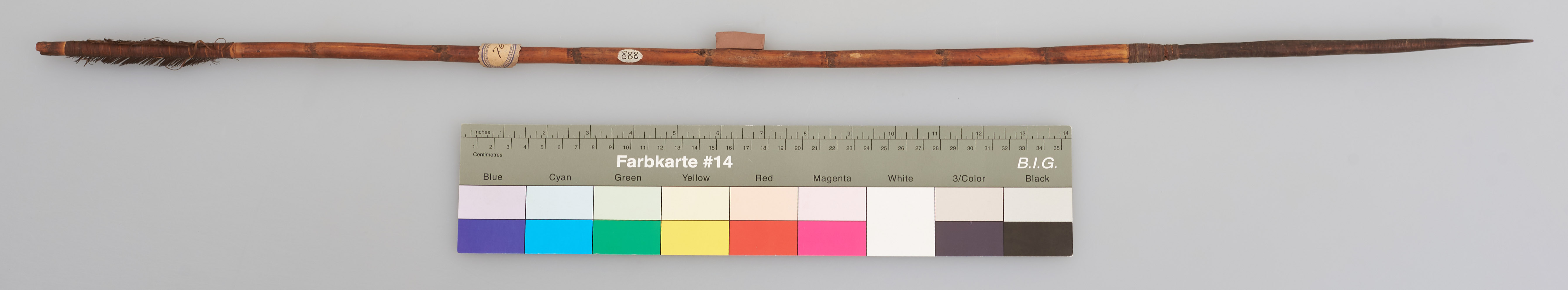 | 扩展说明 | Pfeil mit Rohrschaft, Holzspitze, umwickelter Schäftung und Flugsicherung. Ende gekerbt. Laut Inventarbuch des Landesmuseum Natur und Mensch Oldenburg "zum Vogelschiessen. Usukuma". |