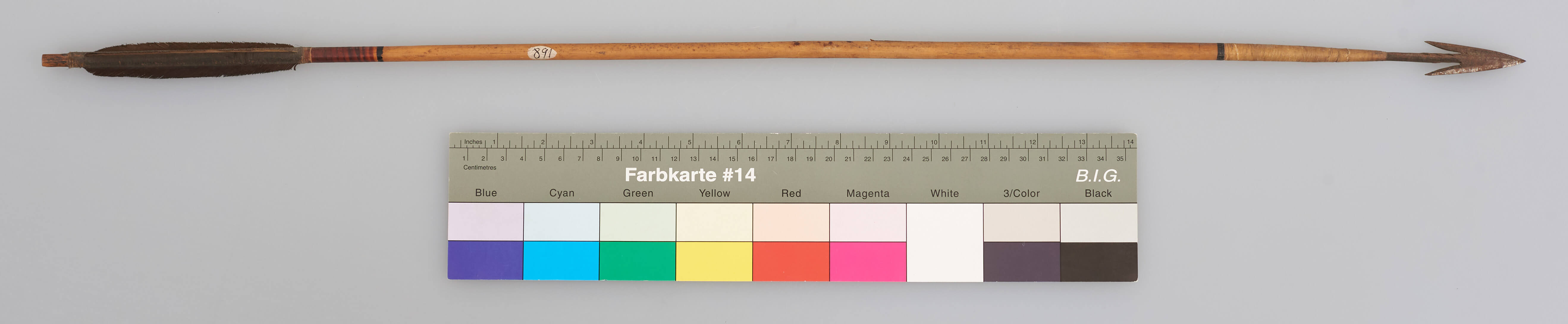| 扩展说明 | Pfeil mit Holzschaft, Metallspitze mit 2 Widerhaken und Flugsicherung. |