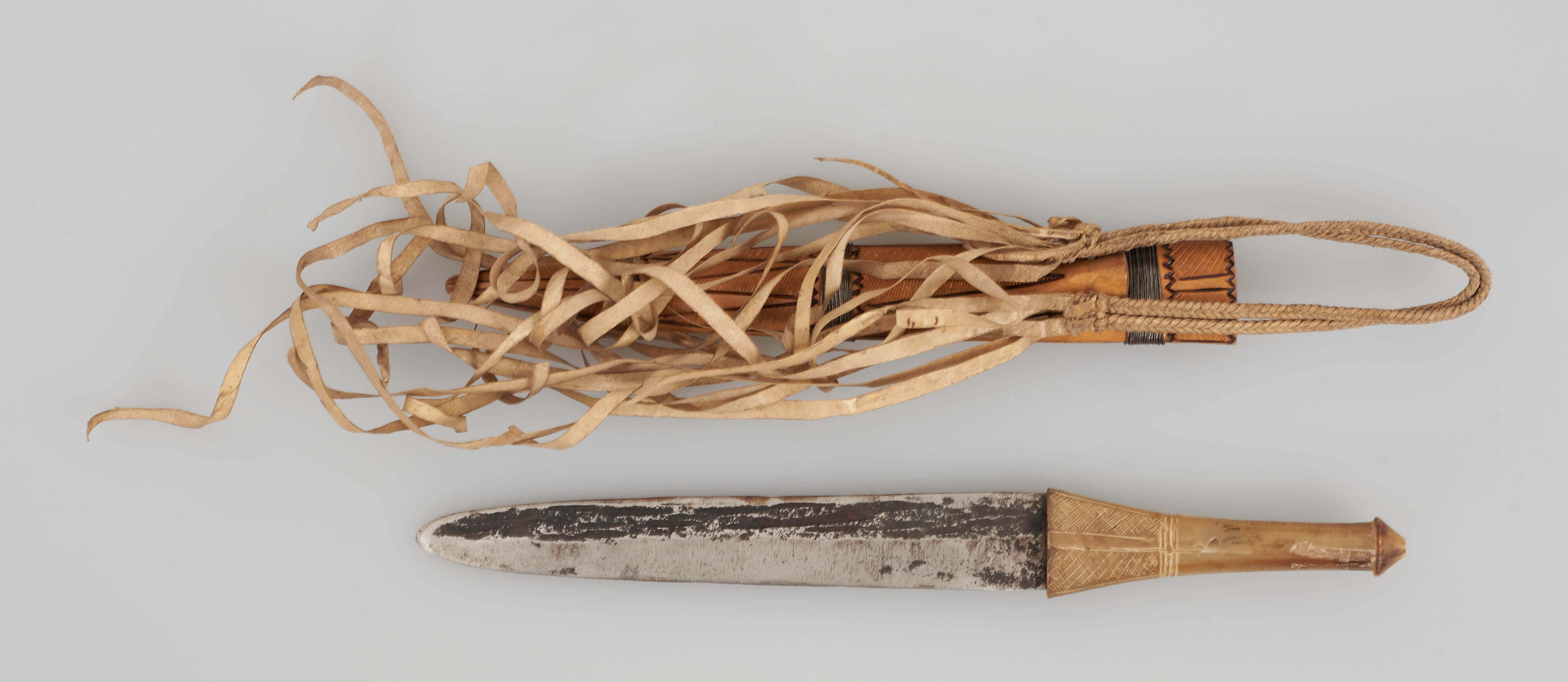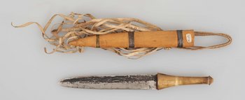 | 扩展说明 | Zweischneidiger Dolch mit Horngriff. Der Knauf ist rund gearbeitet. Scheide aus Holz, teilweise brandverziert, mit Umwicklungen aus Eisendraht und befestigten Lederfransen. Laut Inventarbuch des Landesmuseum Natur und Mensch Oldenburg "aus Kisiba". |