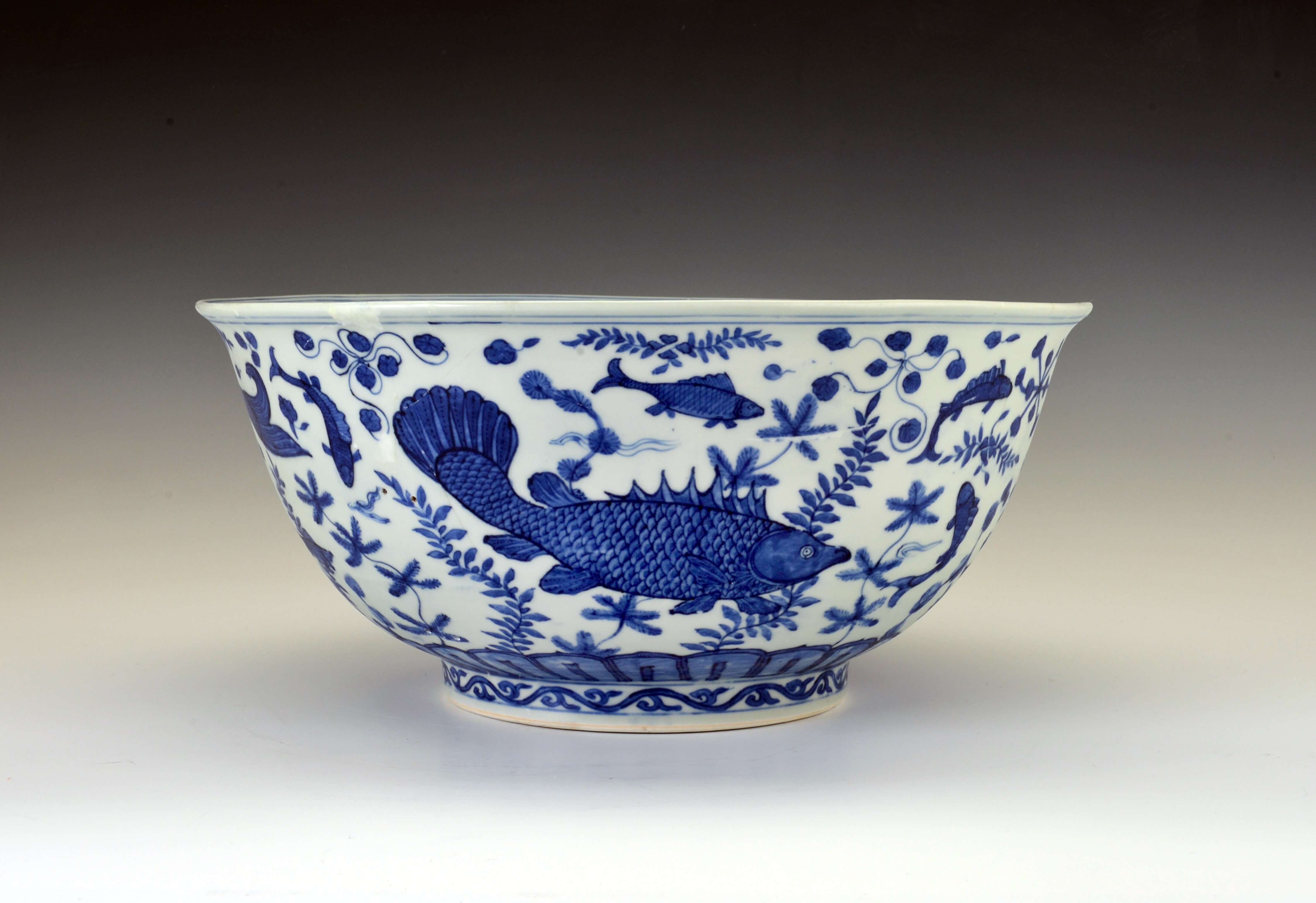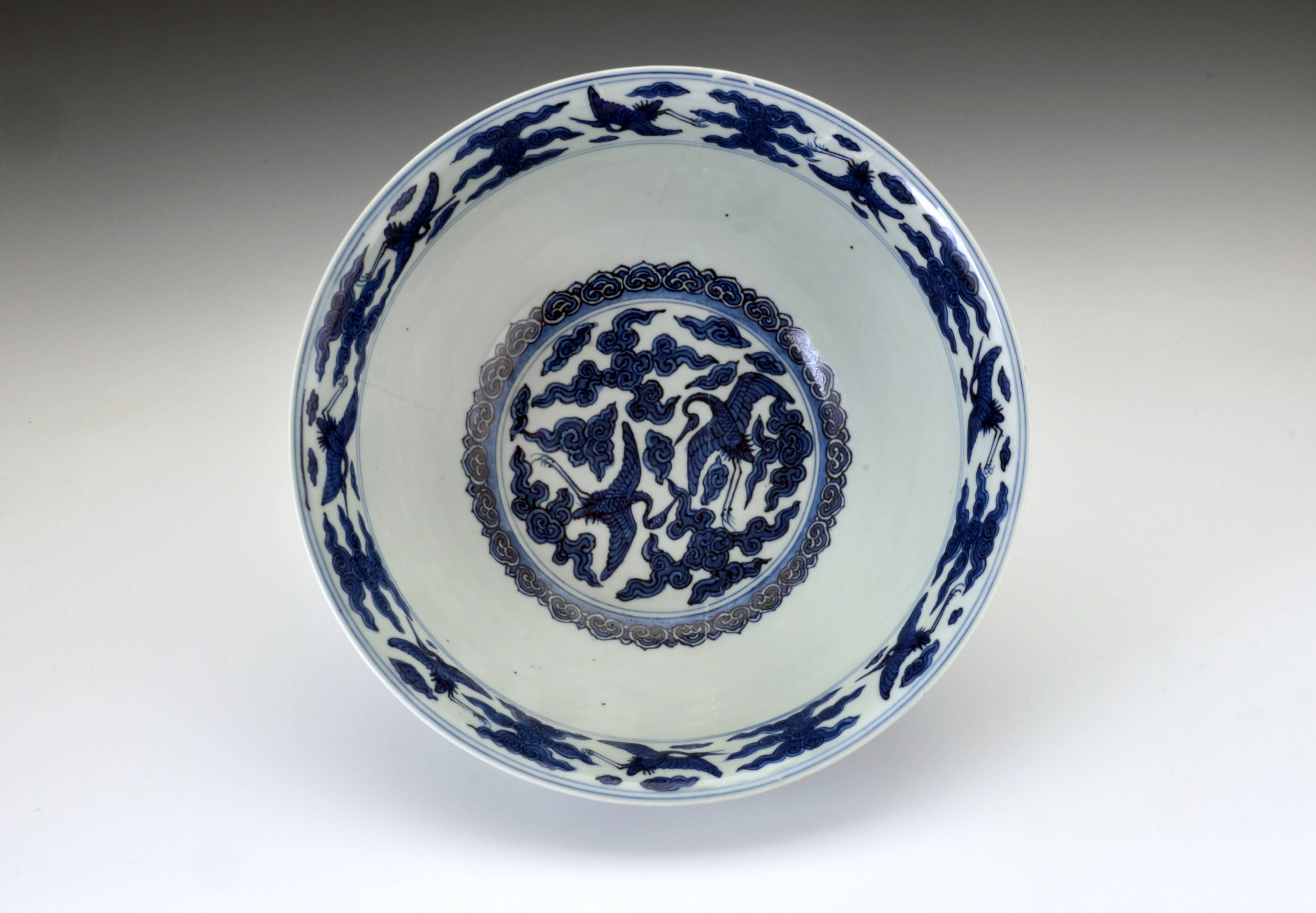 | 扩展说明 | Unterglasurbemalung, kobaltblau. Außen: Fische zwischen Wasserpflanzen, innen: Reiher zwischen Wolken. Das Objekt ist im Katalog durch Ohlmers Sammlung unter der Nr. 177a (1932) und Nr. 45 (1898 Blauweiß) zu finden. |