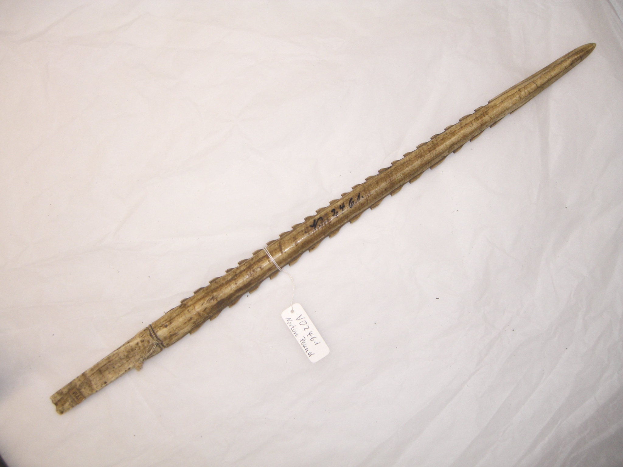 | 登记信息抄录 | „Neujeritt“, Spitze für einen Vogelspeer zur Wasserjagd aus Knochen. 39 cm lang. |