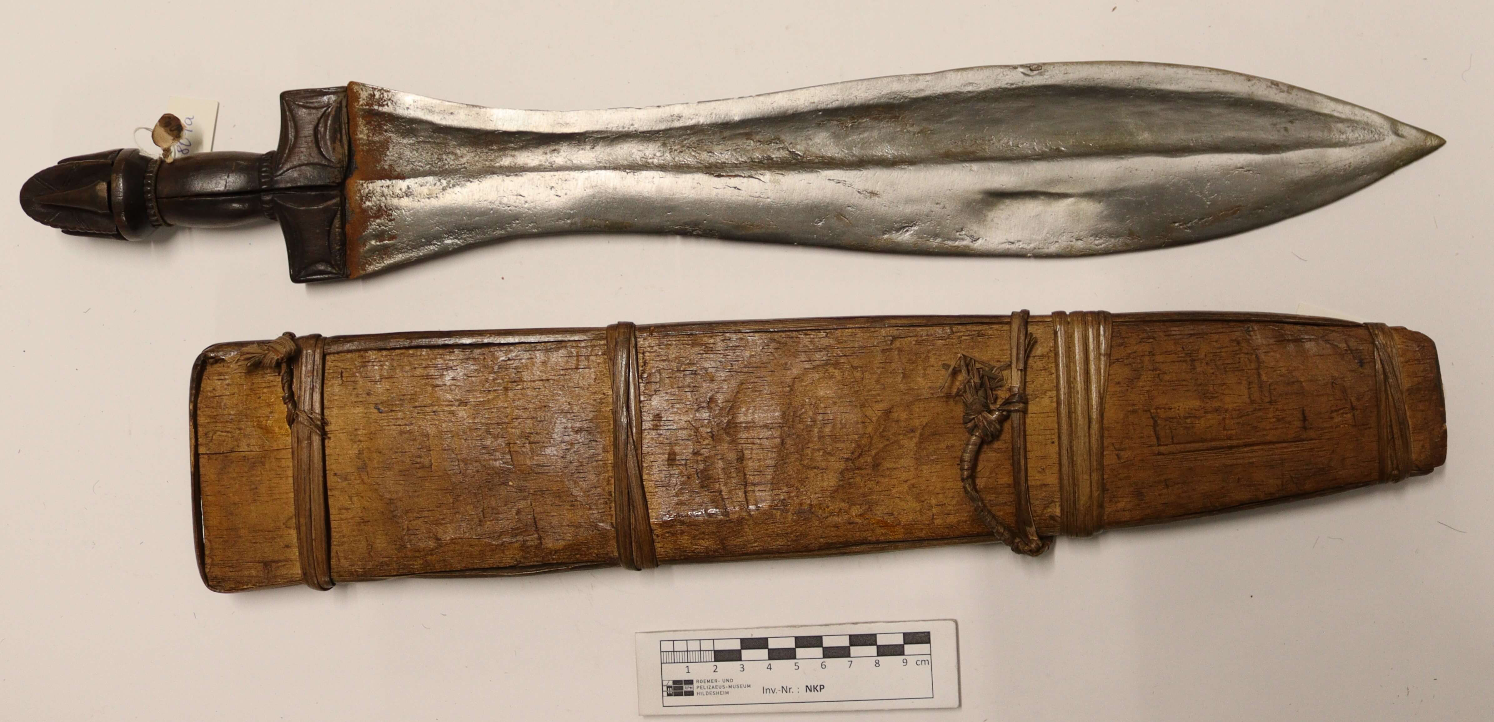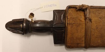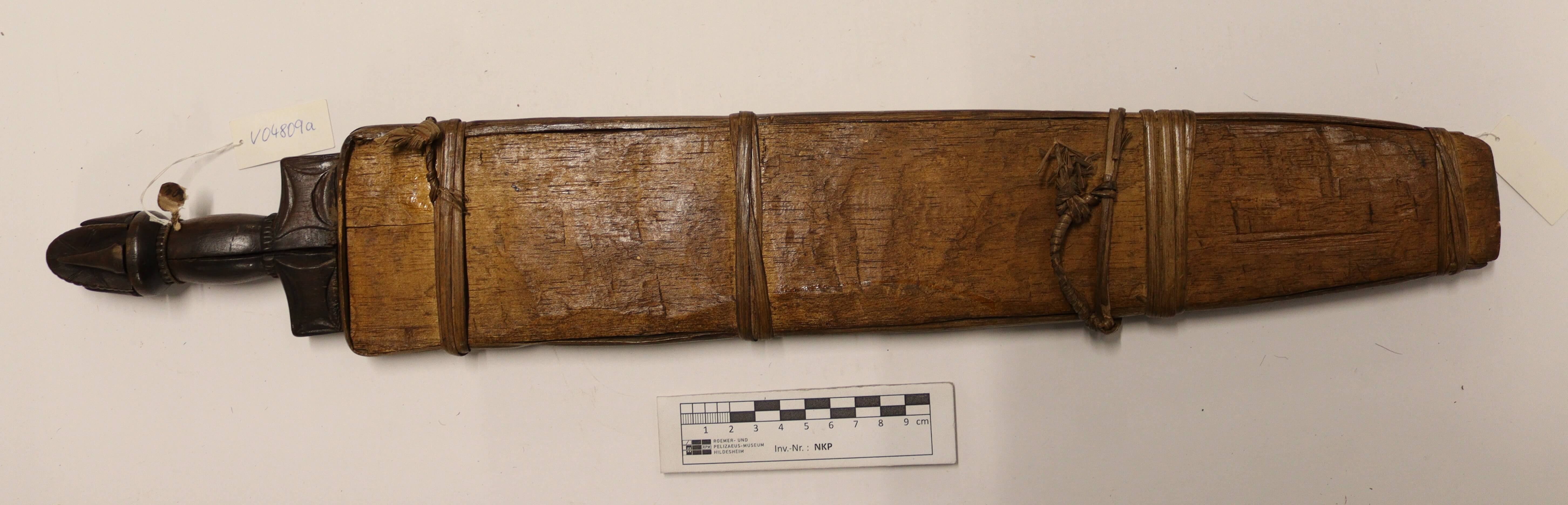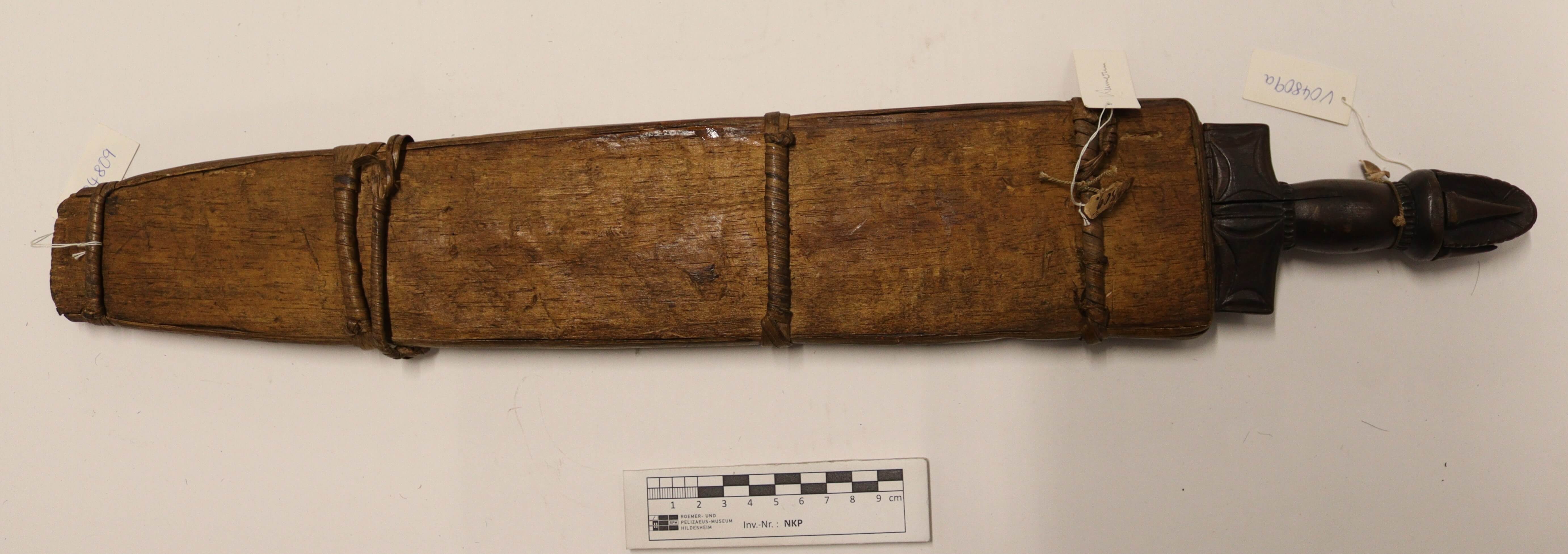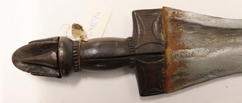 | 登记信息抄录 | Messer mit geschnitztem Griff u. roher Holzscheide. Bali, Kamerun. 133/05. C. Hoppe. Kauf. |