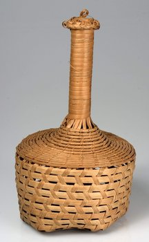 | 扩展说明 | alte Karteikarte: " Klapper, weitmaschige Flaschenbast mit Stiel, innen mit kleinen Steinen." Nach Hecht mit "Bambusgriff" Knöpfli beschreibt die Herstellung und den Gebrauch einer Korbrassel. Die Materialien sind Lianen und die Rinde der Mittelrippe der Raphiapalme. Auf den geflochtenen Boden kommt eine Scheibe Kalebassenschale. Als Rasselkörper werden schwarze Samen der roten afrikanischen Lilie oder der Paradiesvogelblume verwendet. |