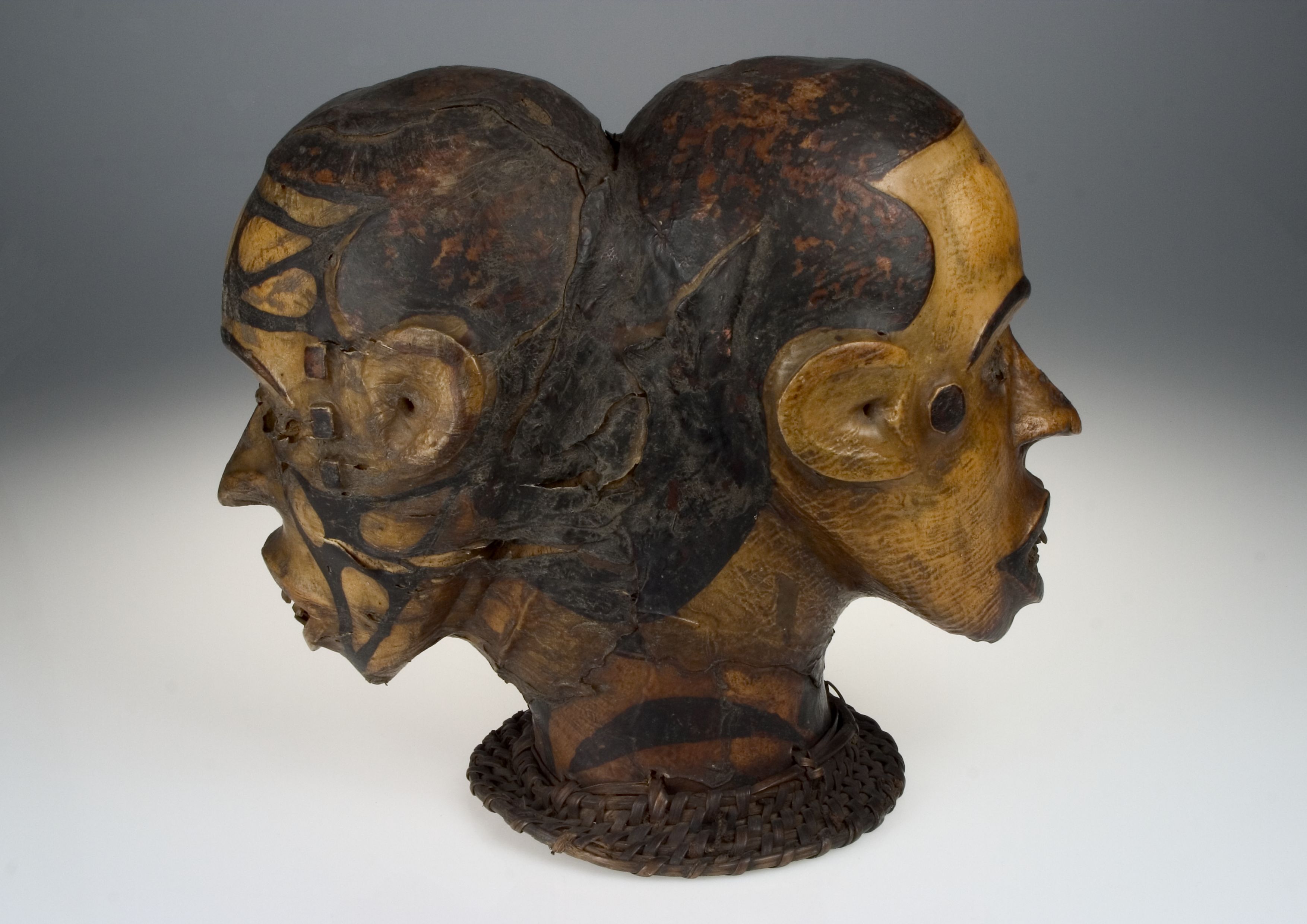 | 扩展说明 | Alte Karteikarte: "Ali. Nordkamerun. Fetischkopf, Holz mit Haut überzogen. Der Fuß wird durch einen Kranz von Bastgeflecht gebildet" Dazu Bleistiftnotiz: " Nach Strümpell angeblich Menschenhaut". Nachgewiesen wurden bei den untersuchten Masken der Ejagham Antilopen- und Affenhaut. Angeklebte Haare sind meist Menschenhaar. Die Haut ist bei den beiden Köpfen an einigen Stellen eingerissen. Der Mund ist tief eingeschnitten und wie eine Mundhöhle gestaltet. Holzstifte sind als Zähne eingesetzt. Beide Gesichter weisen Schmucknarben auf. Doppelmasken symbolisieren den Dualismus "Hell-Dunkel", "Frau-Mann" und "Leben-Tod". Einer Legende zufolge handelt es sich um die Darstellung eines berühmten Kriegers, dessen Frau ihn in den Kampf begleitete. Häufig stehen janusköpfige Masken oder Figuren für Weitsichtigkeit: für den Blick zurück in die Vergangenheit und den Blick nach vorn in die Zukunft. Zu dieser Aufsatz-Maske trug der Maskenträger eine zeremonielle Waffe. (E. Haase, vor 2019) |