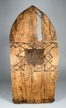 | 扩展说明 | Anmerkung auf der alten Karteikarte: „Großer Schild (etwas gebogen) aus leichtem Holz. Inselbewohner des Tschad (Insel Kuri).“ Das Schild hat sich weiter verbogen und weist einige Fehlstellen auf. Im Bereich des Griffs sind auf Vorder- und Rückseite Fellstücke angebracht. Wie bei Nr. 677 sind mit Lederbändern Ornamente eingearbeitet. |