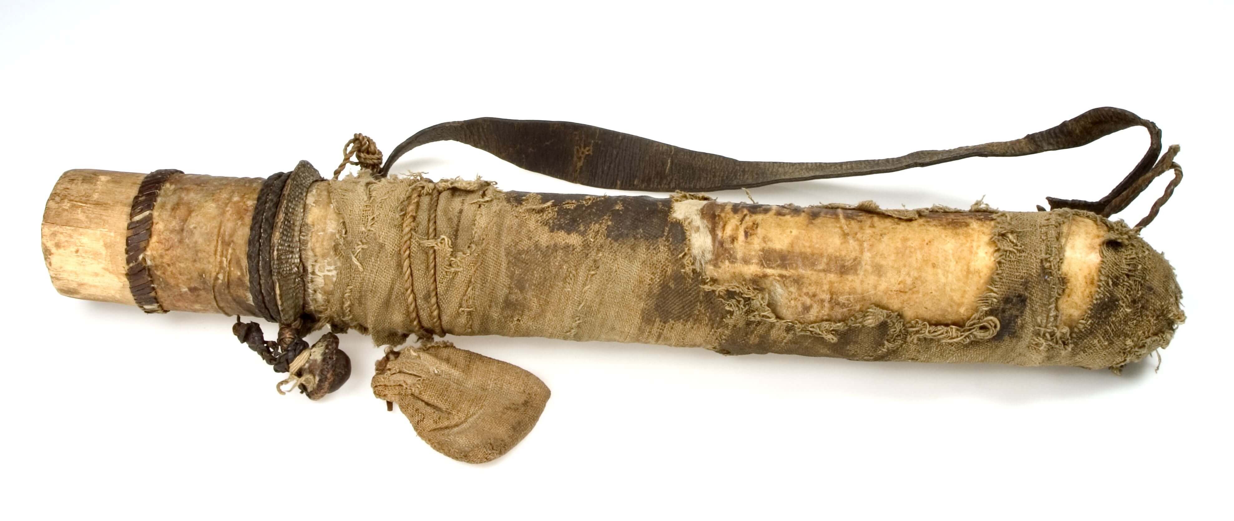 | 扩展说明 | Anmerkung auf der alten Karteikarte: „Köcher (ohne Deckel) mit 20 Pfeilen (Rohr u. Eisen, z. T. vergiftet). Runde Holzröhre mit Leder überzogen und alten Zeugstreifen umwickelt; Tragriemen aus Leder; umgebunden ein kleiner Tuchbeutel, der wahrscheinlich einen Zauber enthält. Im oberen Rand steckt ein Eisen zu Federschmuck (A III c 636 b). Viele Pfeile mit einer Masse beschmiert (wohl Gift).“ Als ethnische Zuordnung ist auf der kolonialzeitlichen Karteikarte "Ngili Wuhum-Heiden" angegeben. Mit „Ngili Wuhum“ war vermutlich das heutige Guili gemeint. Der Ort befindet sich im heutigen Extrême-Nord im Departement Mayo-Tsanaga, an der Grenze zu Nigeria. Er wird v.a. von den Bana gewohnt. Was es mit der Bezeichnung „Wuhum“ auf sich hat, ist nicht nachvollziehbar. Demnach kann das Objekt auf die Bana zurückgehen (Tevodai Mambai und Isabella Bozsa, 8.09.2021). Die Pfeile sind nicht vorhanden. In der Sammlung des Städtischen Museums befindet sich eine große Anzahl von Pfeilen, die aber nicht mehr eindeutig zuordbar ist. |