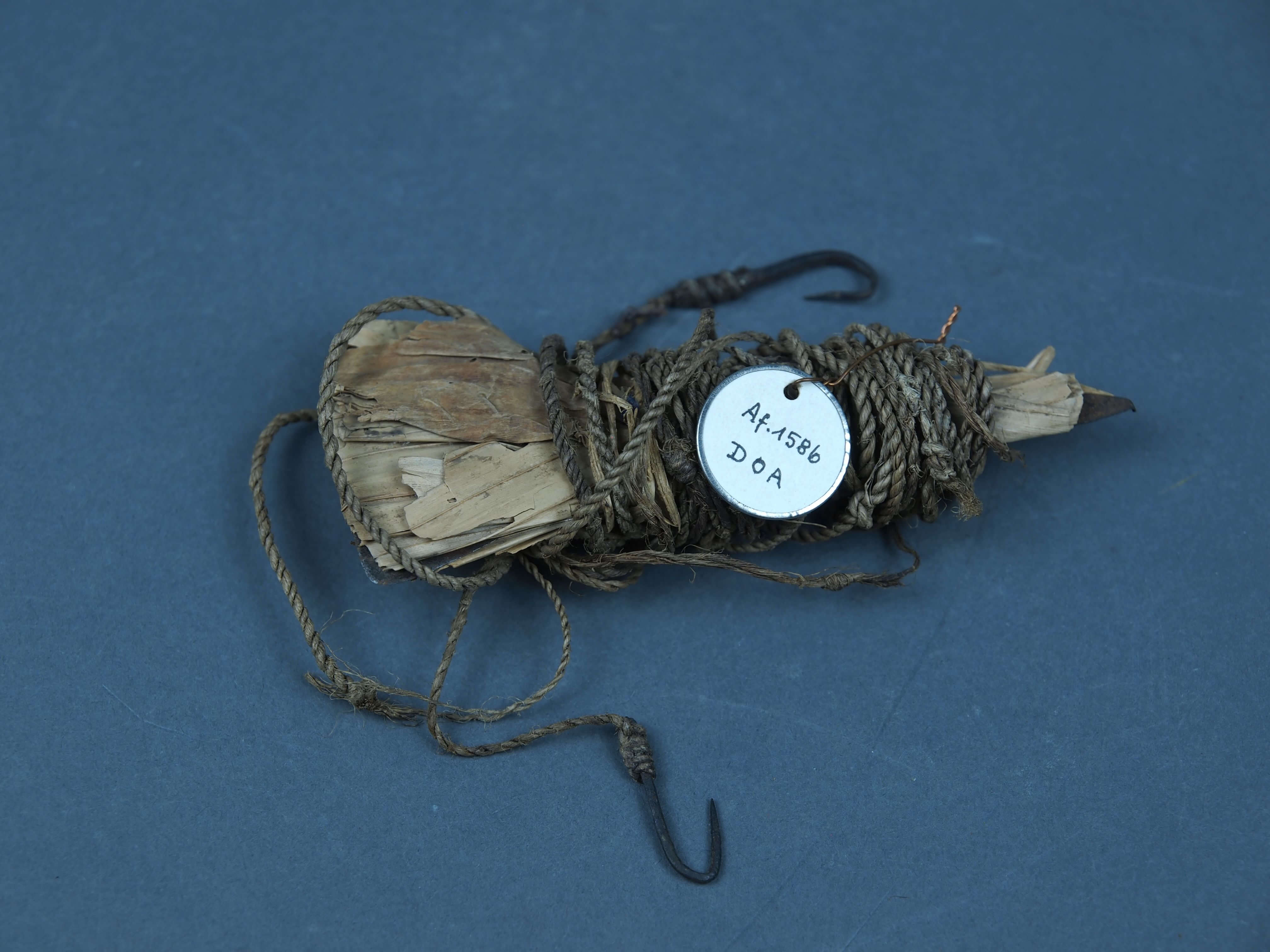 | Erweiterte Beschreibung | Klinge, in getrockneten Schilfblättern, mit Angelgerät (Schnur, Angelhaken) umwickelt |