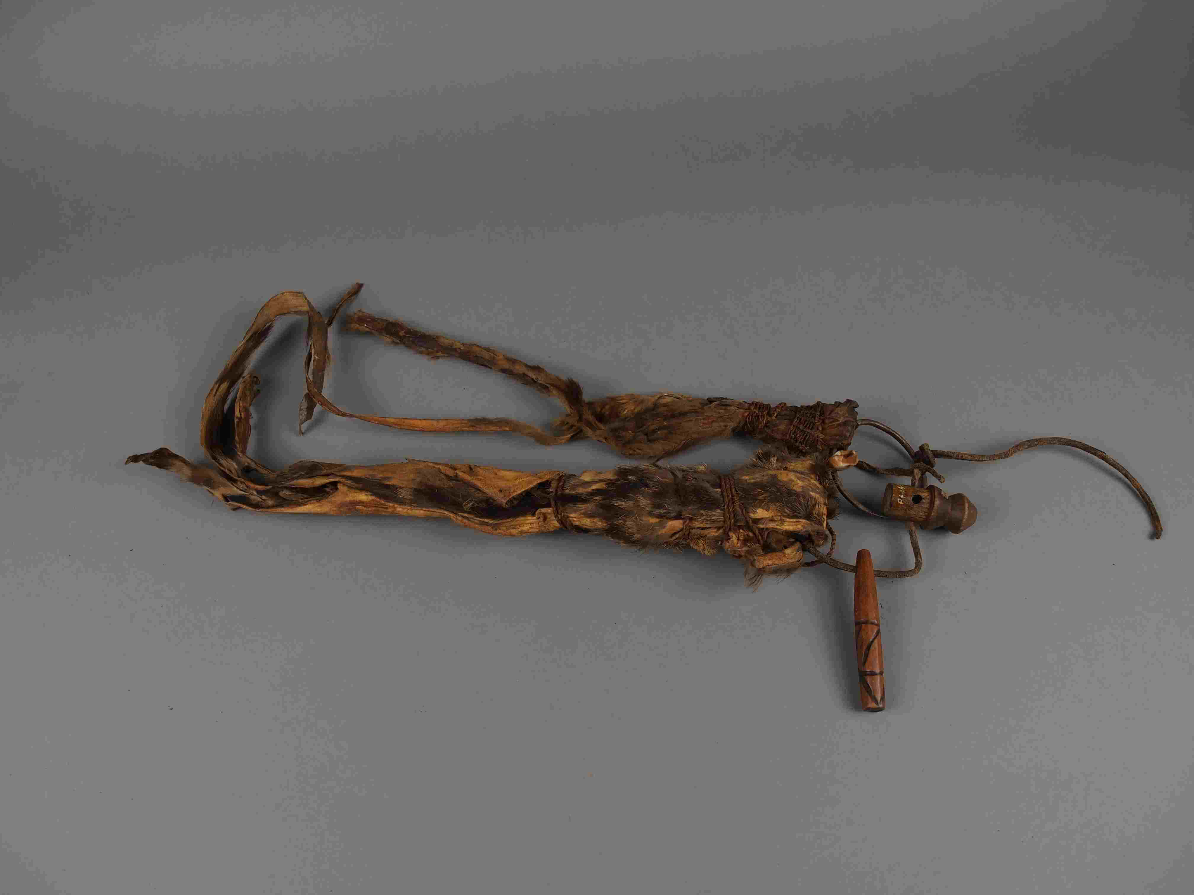| Erweiterte Beschreibung | enthaarter Balg, Lederriemen mit Horn und Holzstück, Eisenring mit Gehörnspitze und Tierbalg |