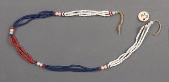 | Erweiterte Beschreibung | Perlen / weiß, blau, rot, auf Fäden gezogen |