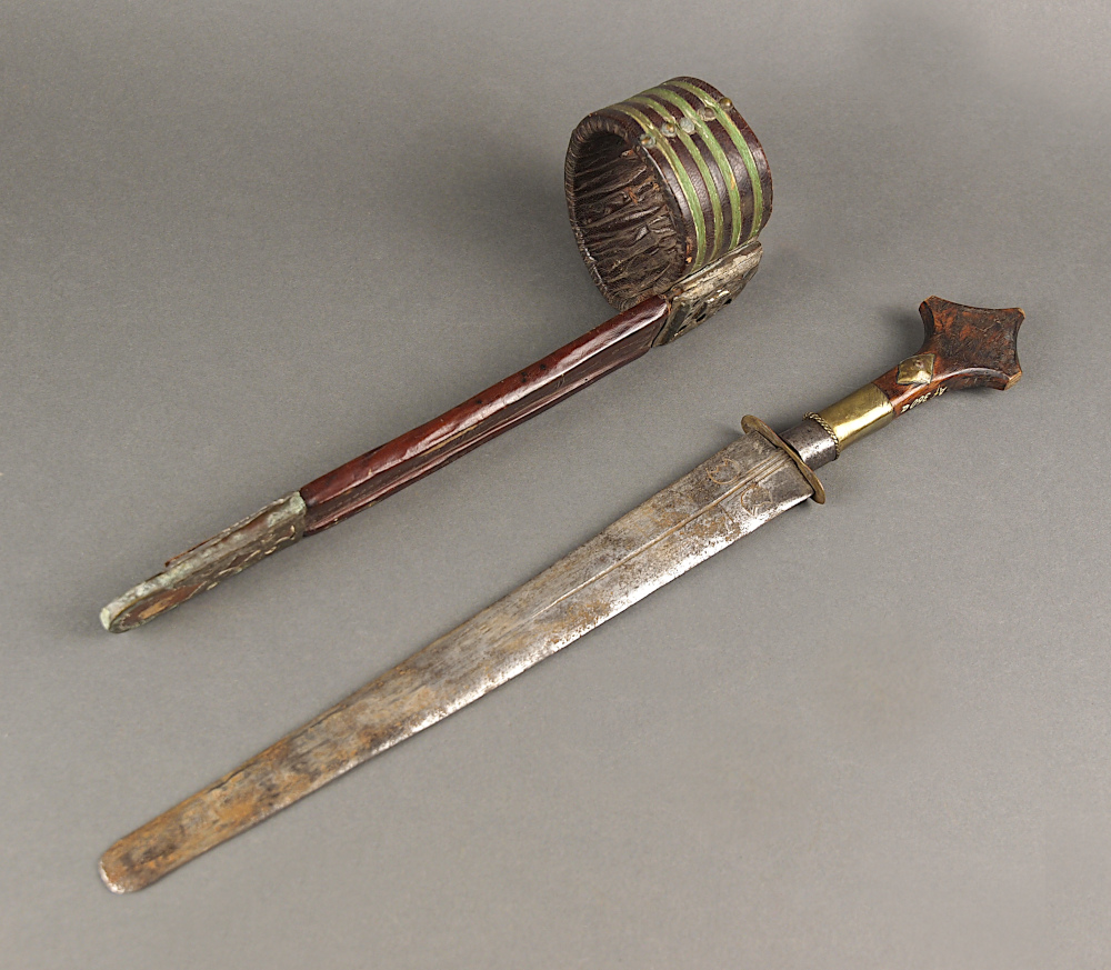 | Erweiterte Beschreibung | a: Dolch, b: Scheide, Scheide aus Leder, mit Holzgriff, schmiedeeiserne Klinge, Ornamente, zwischen Griff und Scheide liegt eine ovale Messingscheibe, oben und unten mit versilbertem Blech beschlagen, lederner Tragring |