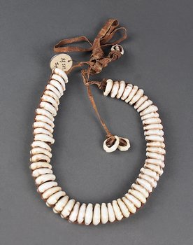 | Erweiterte Beschreibung | Kaurimuscheln auf rotbraunen Lederriemen gezogen, an den Enden verknotet mit 2 Kaurimuscheln in der Schlaufe |