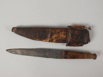 | Erweiterte Beschreibung | a: Messer, b: Scheide Holzgriff, Lederscheide mit Einlagen |