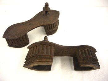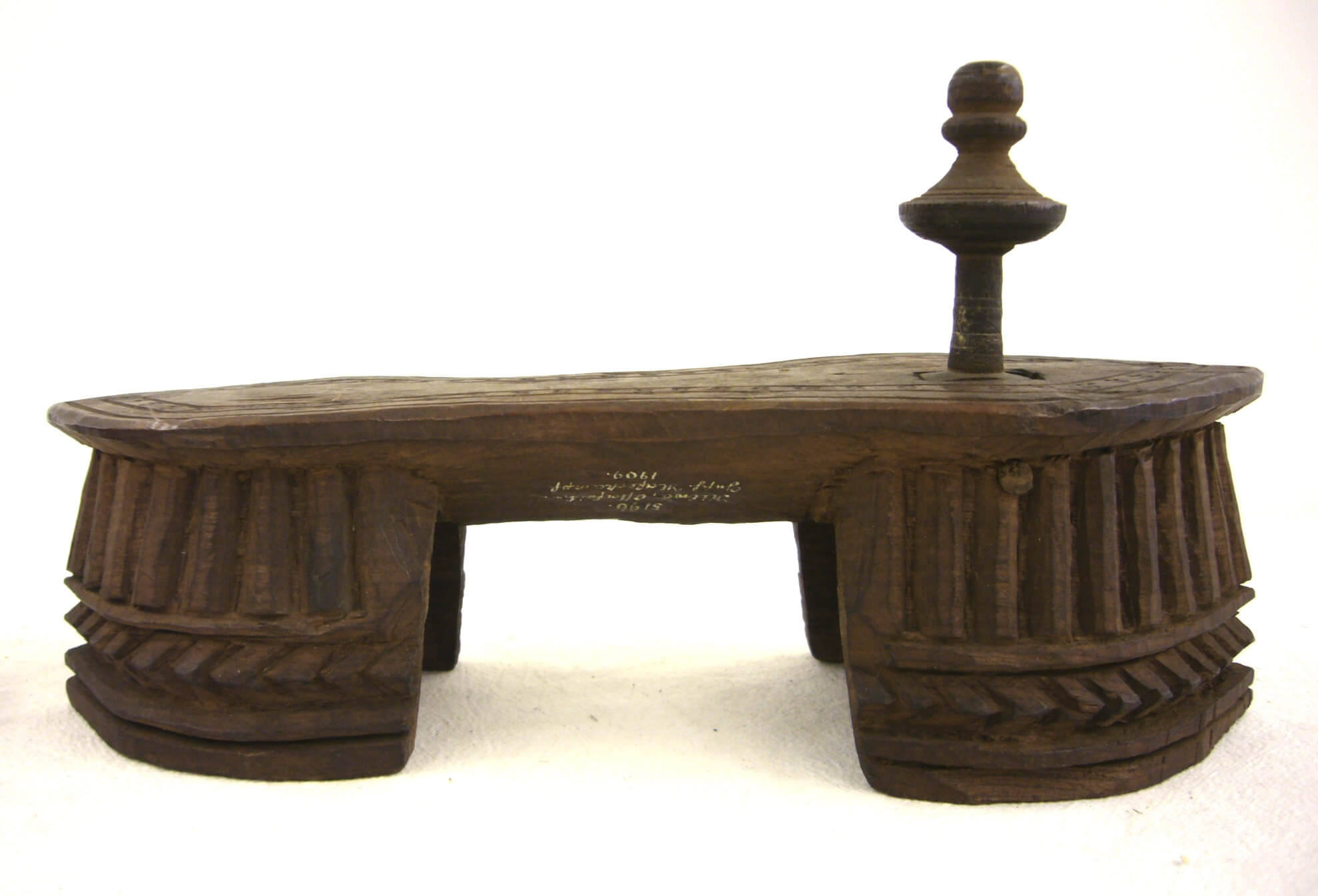 | Inventarbuch-Eintrag | 1 Paar Holzschuhe. "Von Mannschaften S. M. S. «Carola» bei der Erstürmung von Kilwa i. Ostafrika vom 25.V.1890 erbeutet. Der hölzerne Pflock wird zwischen den großen u. der nächsten Zehe des Fußes geklemmt und es watscheln Männer und Frauen damit einher." |