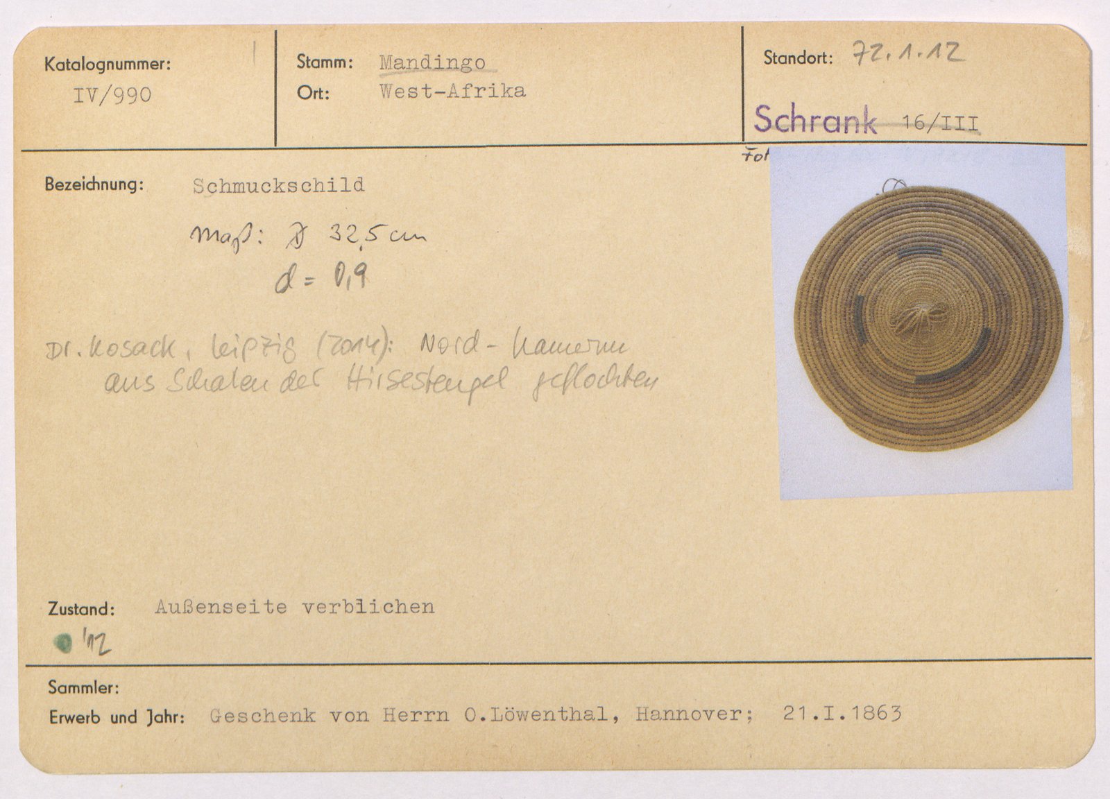 • Am 21. Januar 1863 erworben von/vom Naturhistorische Gesellschaft zu Hannover (NGH) als Schenkung bei/beim Otto Löwenthal.