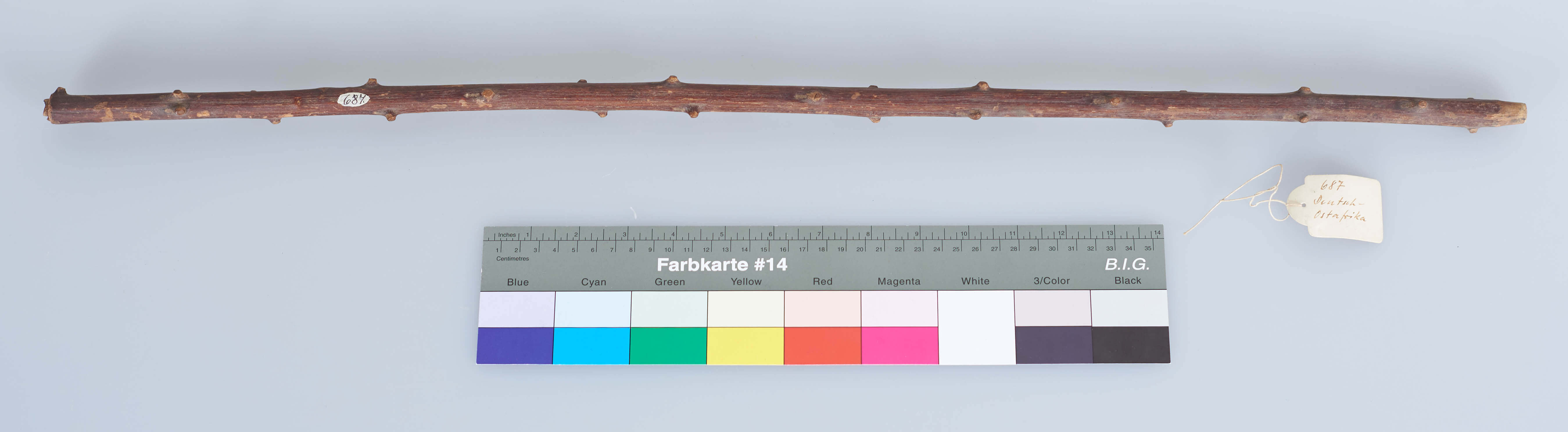 | Erweiterte Beschreibung | Pfeifenrohr. Laut Inventarbuch des Landesmuseum Natur und Mensch Oldenburg zu Pfeifenkopf Nr. 0677 (268) "aus Uganda" gehörig. |