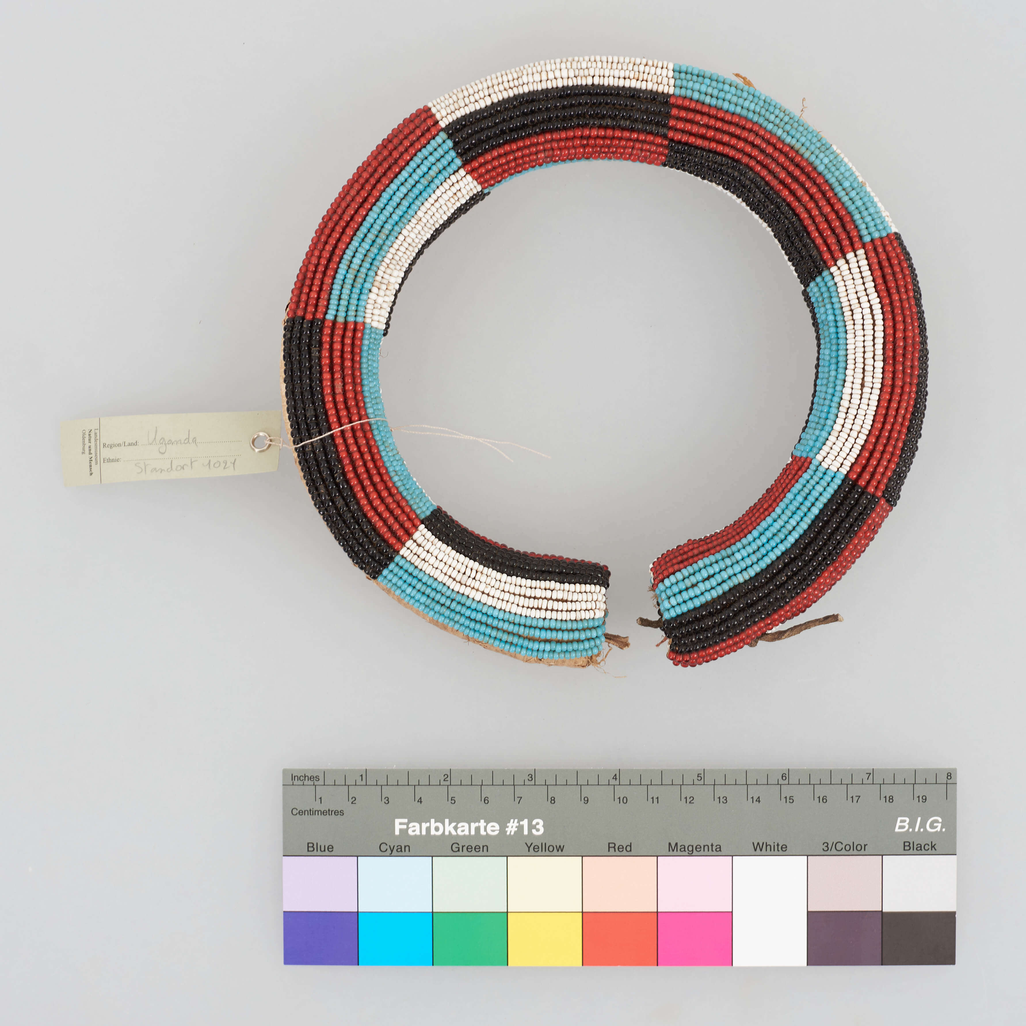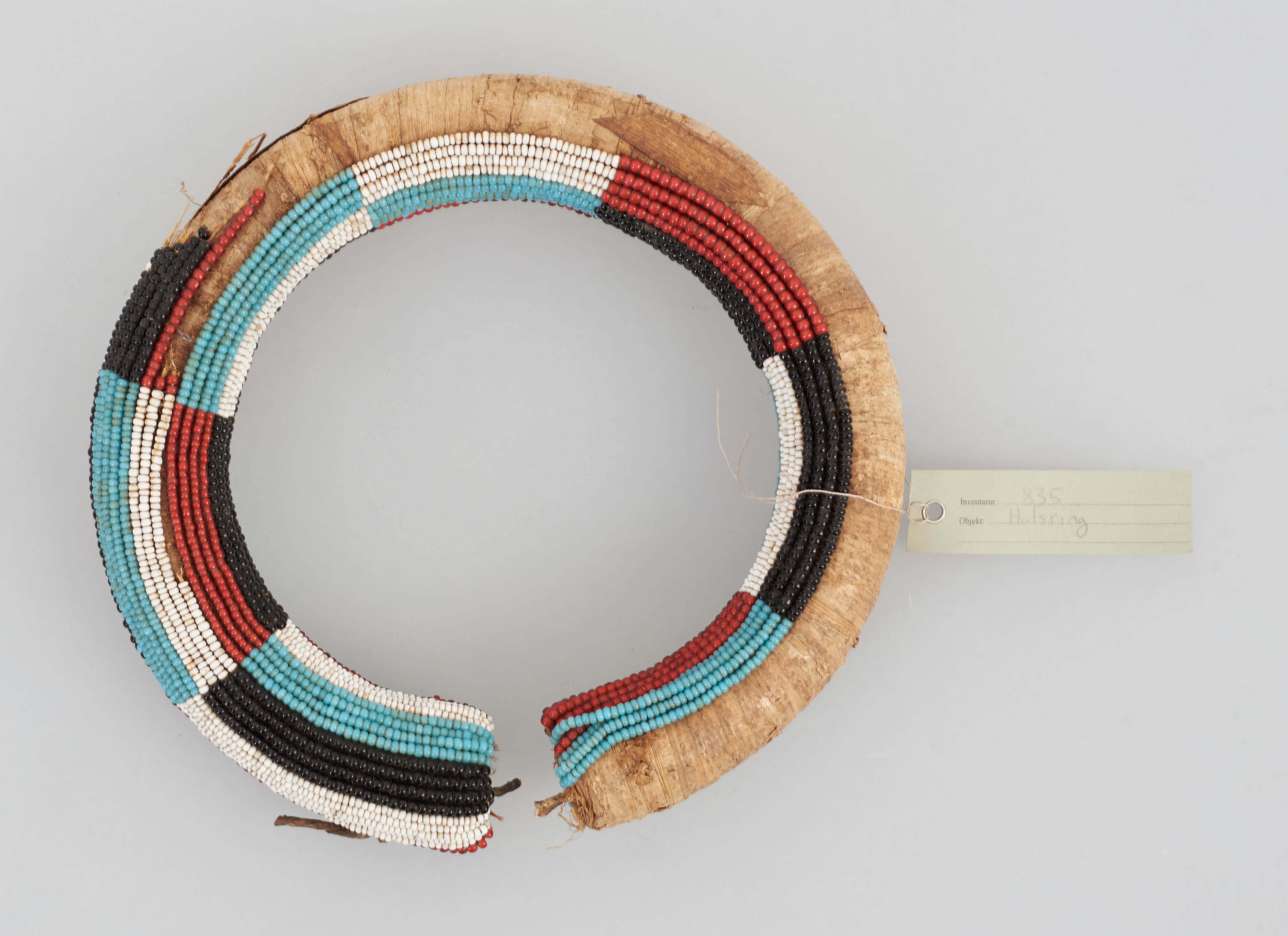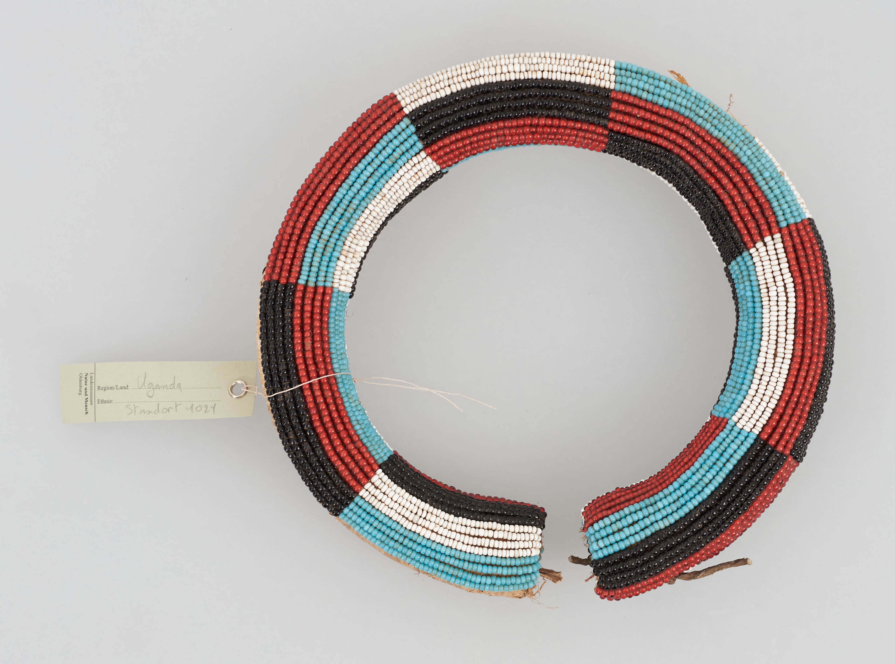 | Erweiterte Beschreibung | Perlen auf gewickeltem Strang, hellblau, schwarz, rot, weiß, stark beschädigt. |