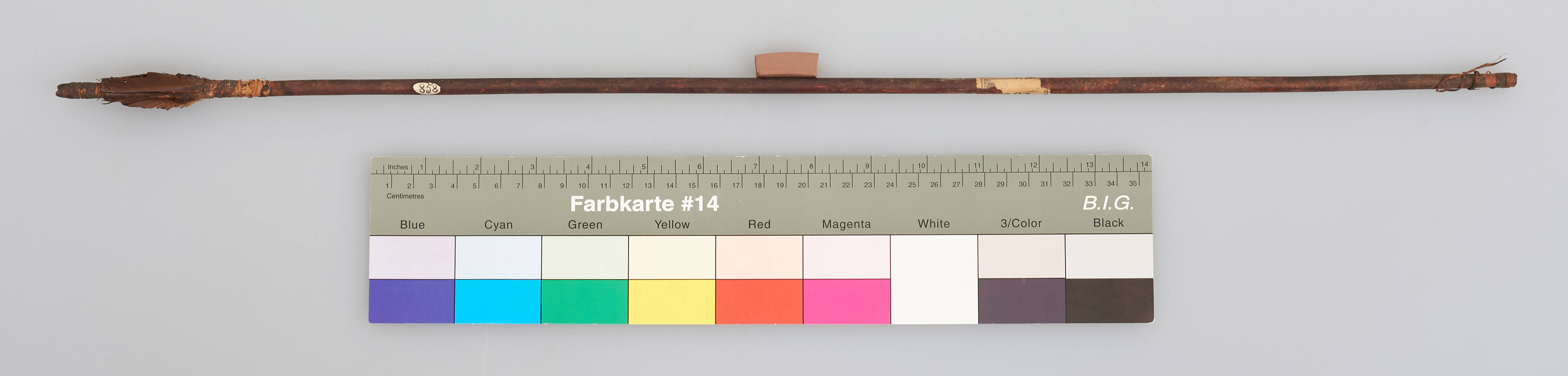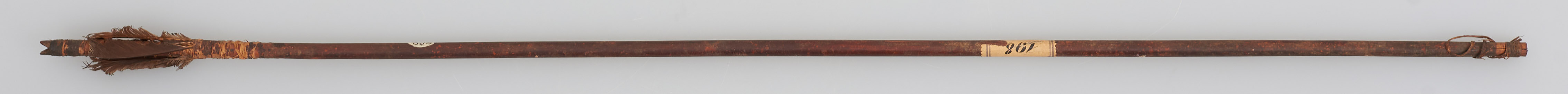 | Erweiterte Beschreibung | Pfeil mit Holzschaft und Flugsicherung. Spitze verloren. Schäftung und Ende umwickelt. Ende gekerbt. |