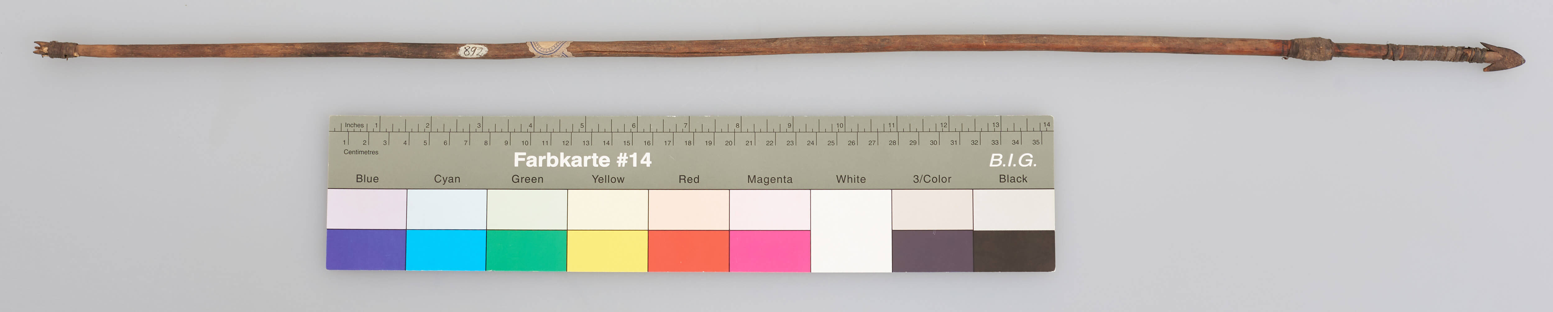 | Erweiterte Beschreibung | Pfeil, bestehend aus einem Holzschaft mit Metallspitze. Flugsicherung verloren. Im Inventarbuch des Landesmuseum Natur und Mensch Oldenburg wird das Objekt als "Pfeil, Usukuma" bezeichnet. |