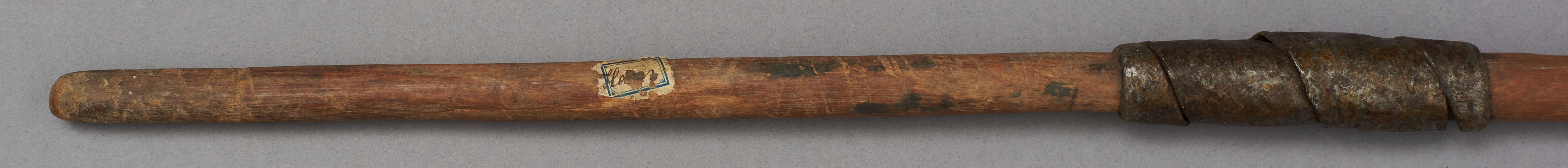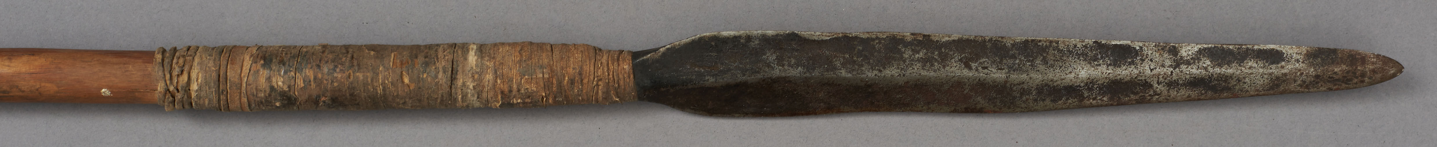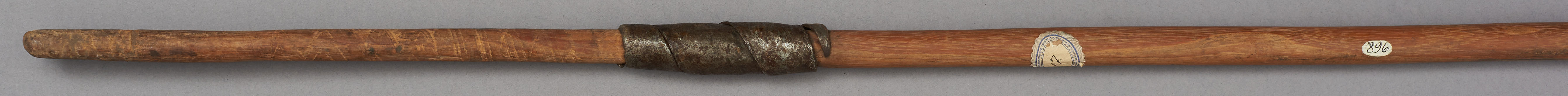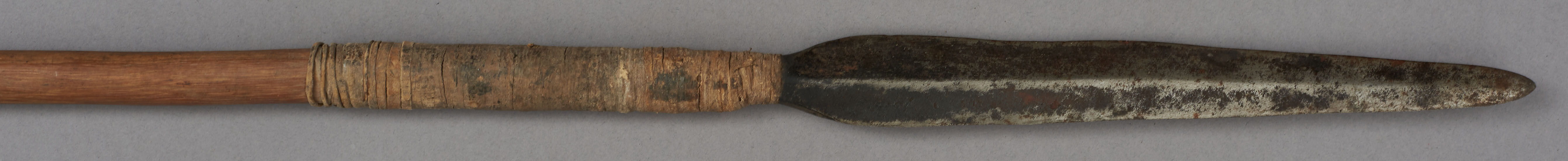 | Erweiterte Beschreibung | Speer mit kurzer blattförmiger Eisenklinge, einem Holzstab und einem kurzen eisernen Gegengewicht. Teilweise mit Leder umwickelt. Im Originalverzeichnis als "Speer aus Mburragebirge" beschrieben. |