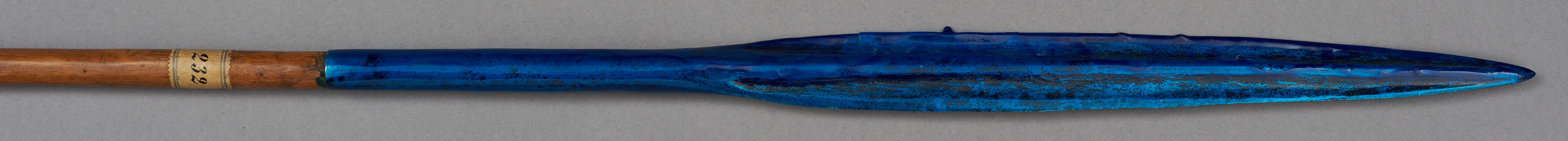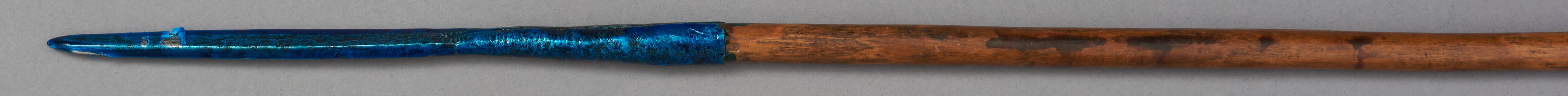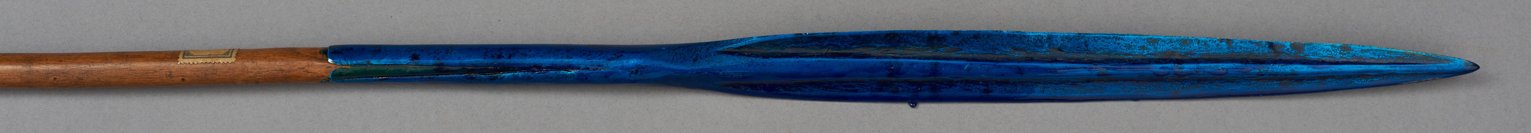 | Erweiterte Beschreibung | Speer mit blattförmiger Eisenklinge, Holzstab und eisernen Gegenpart. Im Originalverzeichnis als "Wurfspies der Massai" beschrieben. Teilweise mit blauem Schutzlack überzogen. |