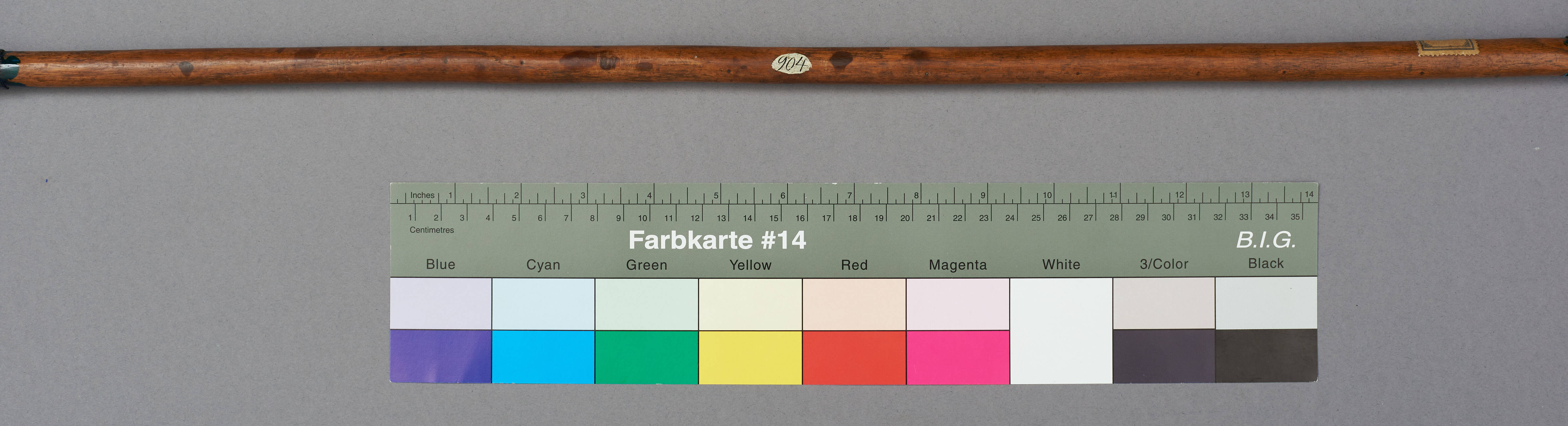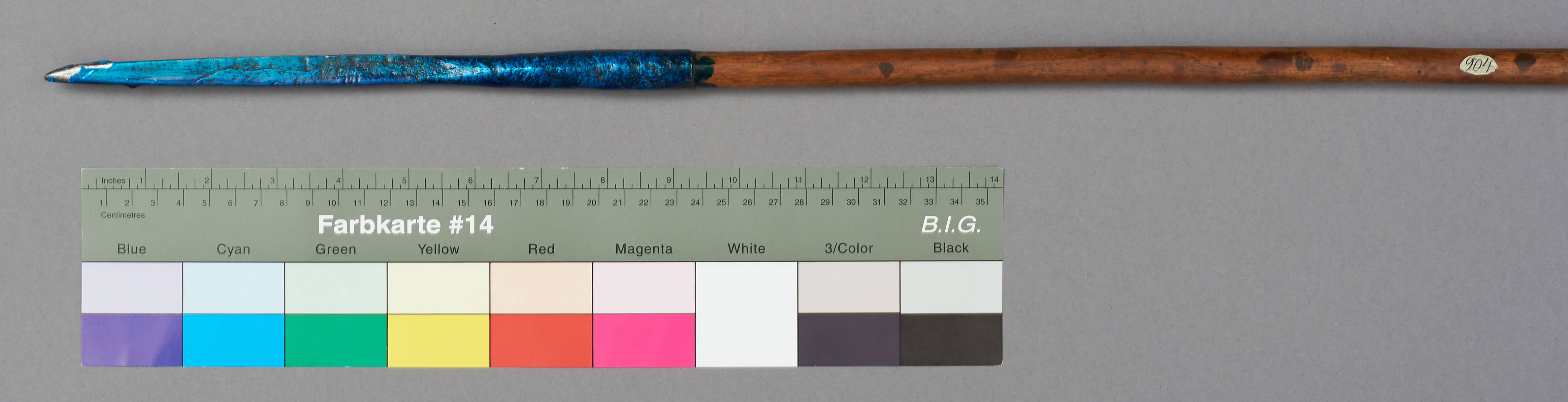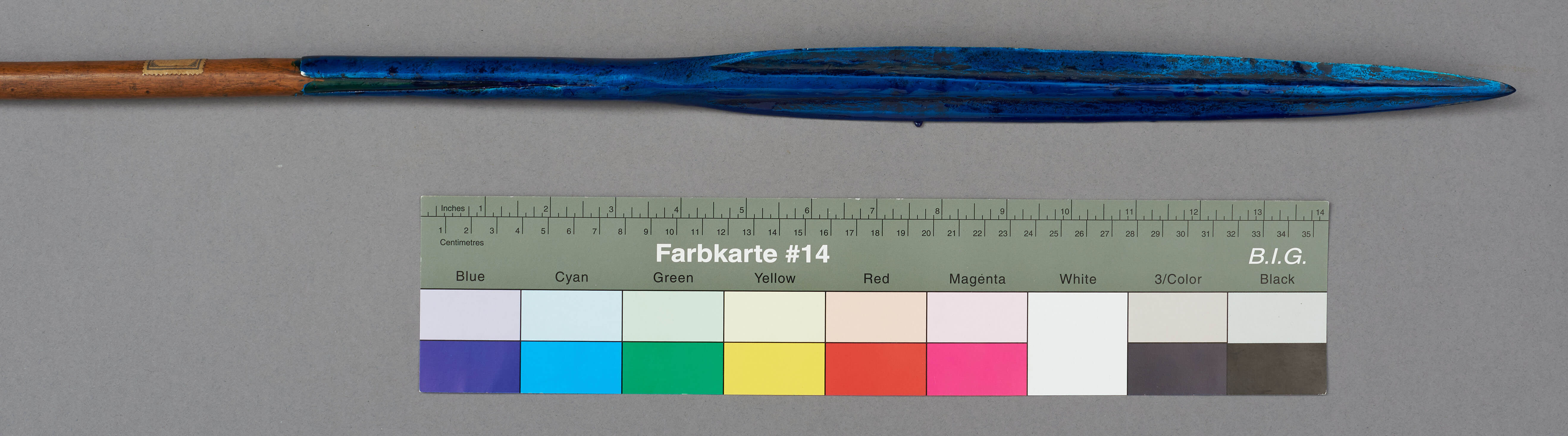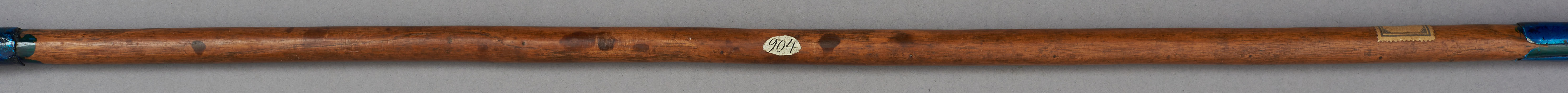 | Erweiterte Beschreibung | Speer mit blattförmiger Eisenklinge, Holzstab und eisernen Gegenpart. Im Originalverzeichnis als "Wurfspies der Massai" beschrieben. Teilweise mit blauem Schutzlack überzogen. |