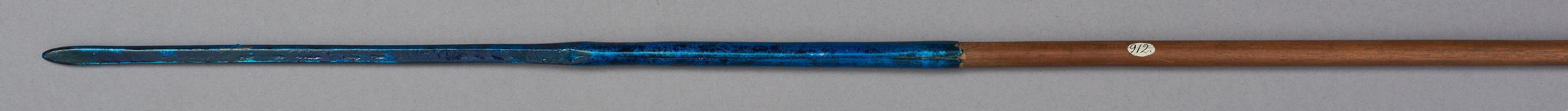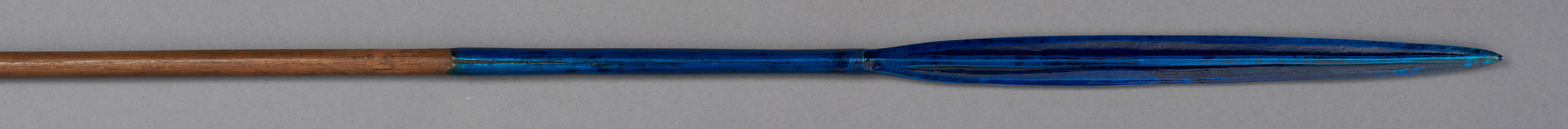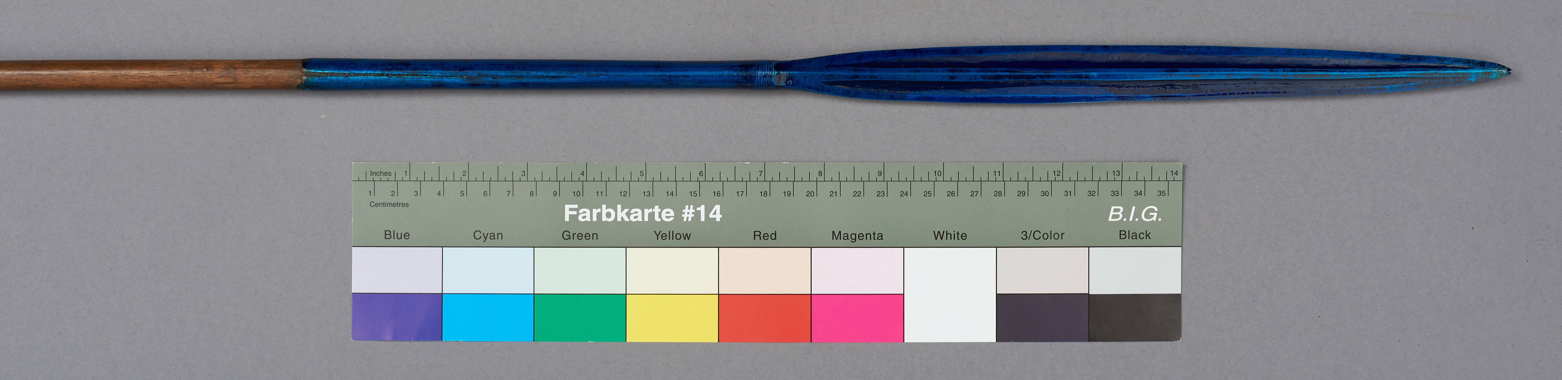 | Erweiterte Beschreibung | Speer mit langer, schmaler blattförmiger Eisenklinge und einem entsprechenden Gegenpart. Teilweise mit blauem Schutzlack überzogen. Im Originalverzeichnis als "Wurfspeer der Massai" beschrieben. |