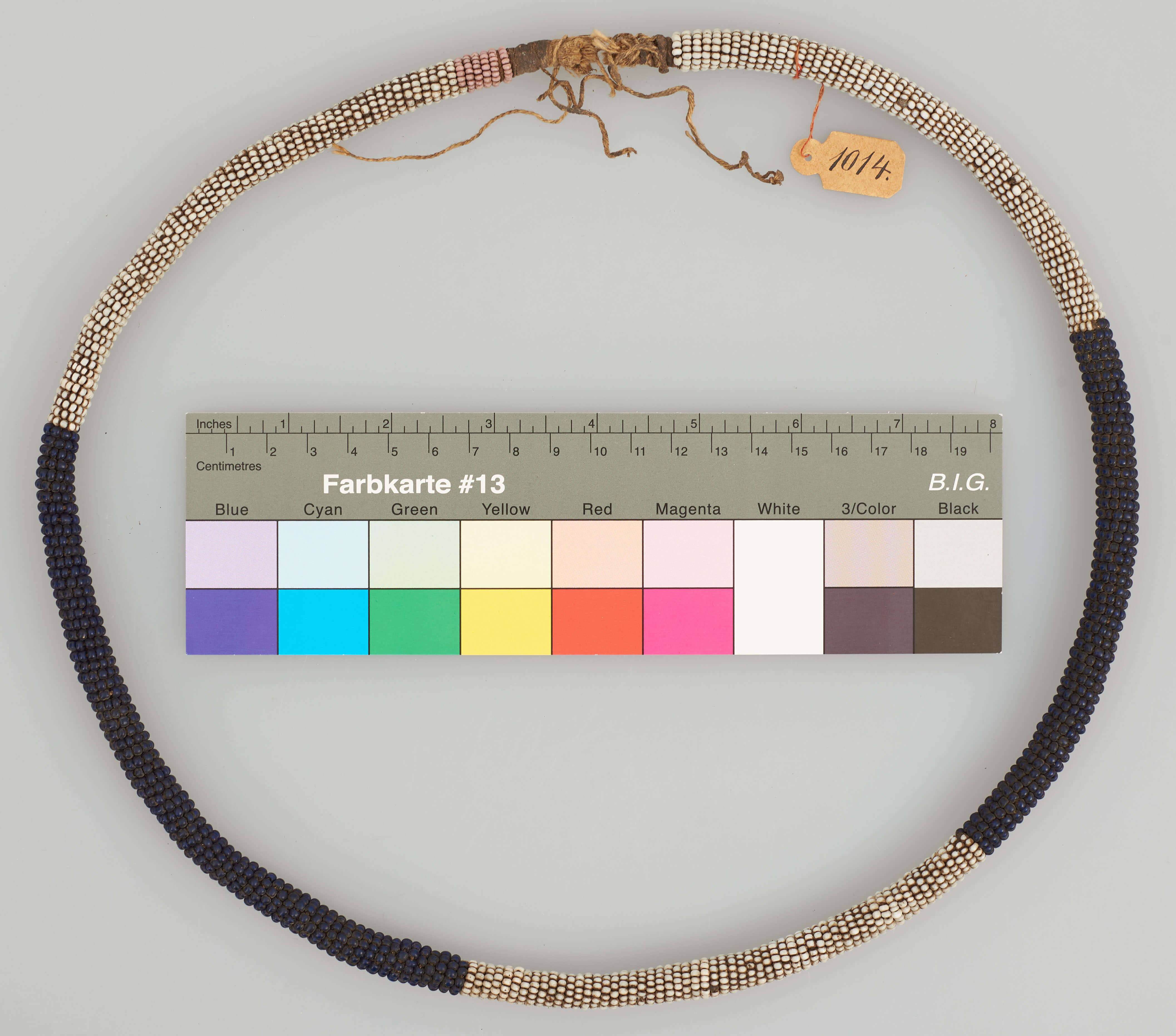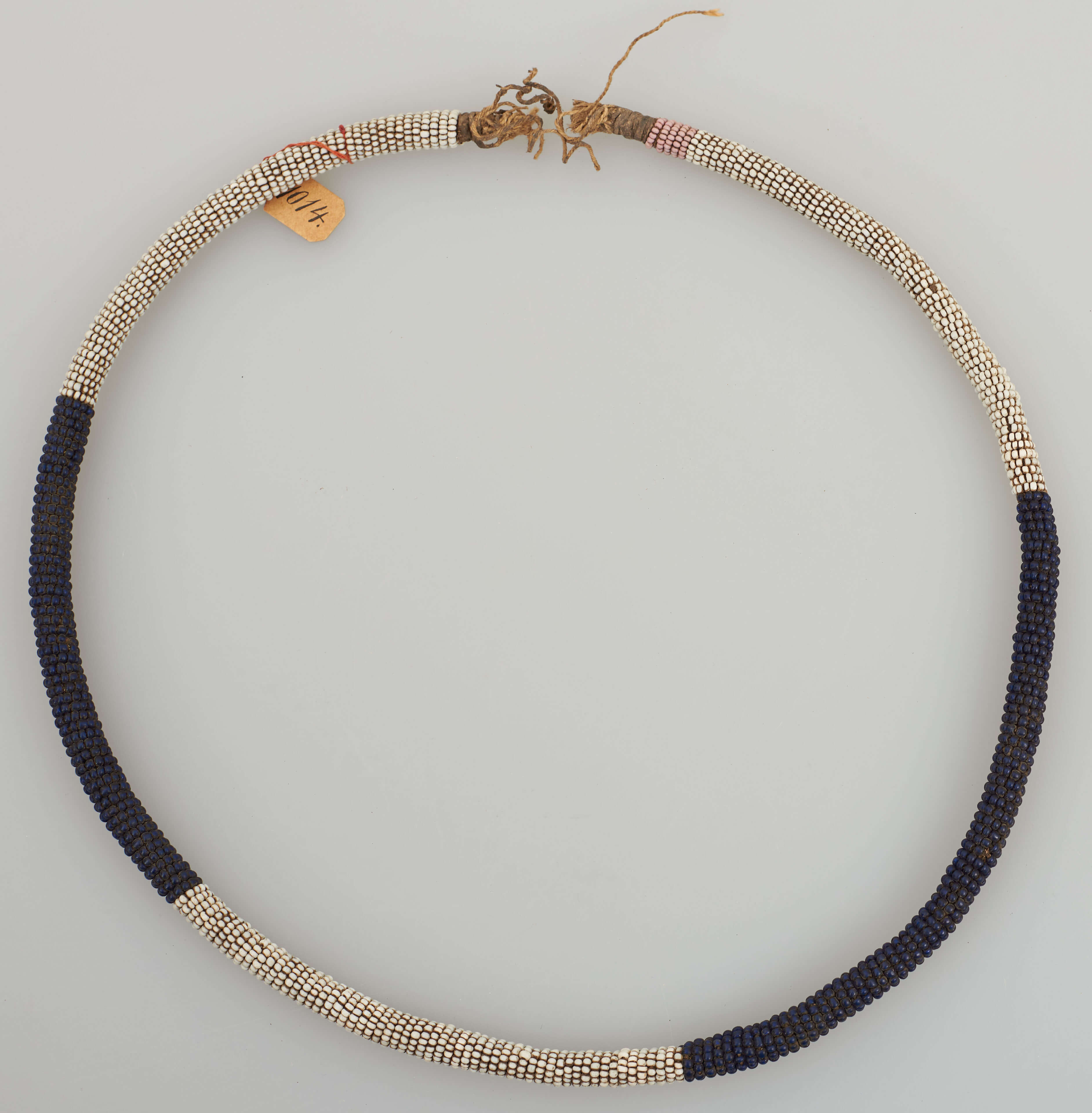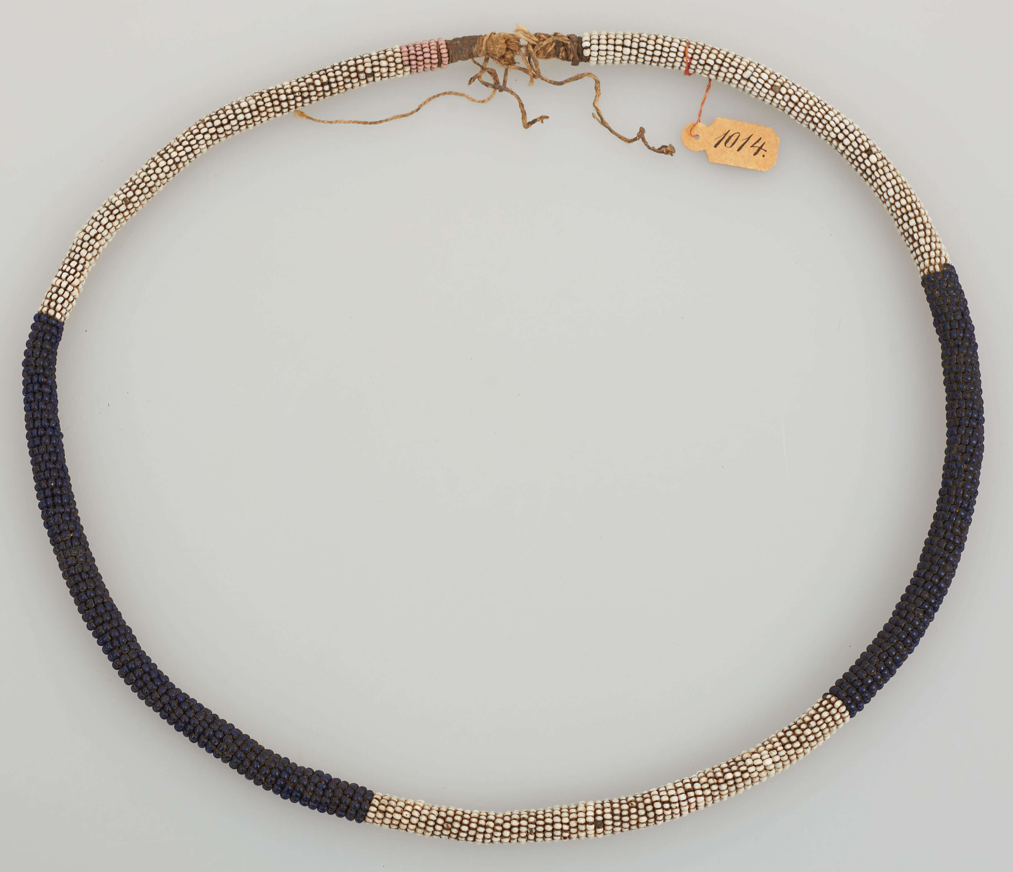 | Erweiterte Beschreibung | Halsschmuck aus Perlen (weiß, blau und rosa). |
