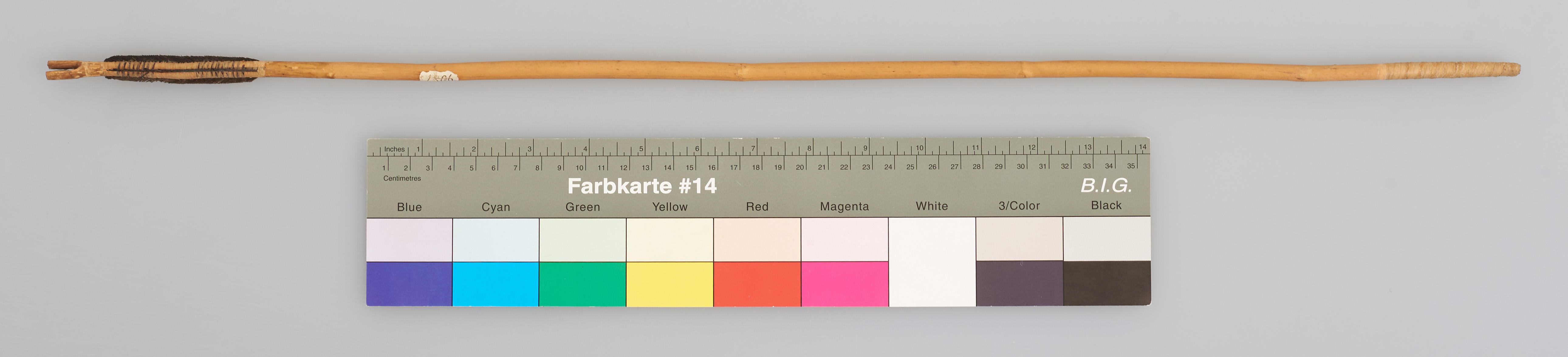 | Erweiterte Beschreibung | Pfeil mit Holzschaft und Flugsicherung. Pfeilspitze fehlt, Schäftung umwickelt, Ende gekerbt. |