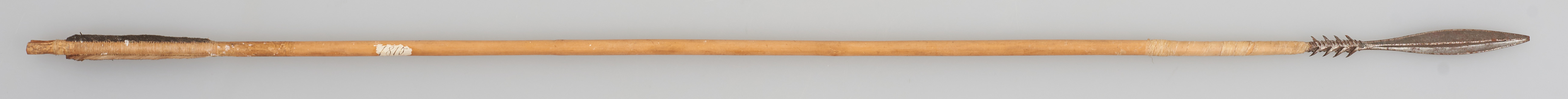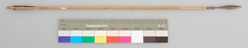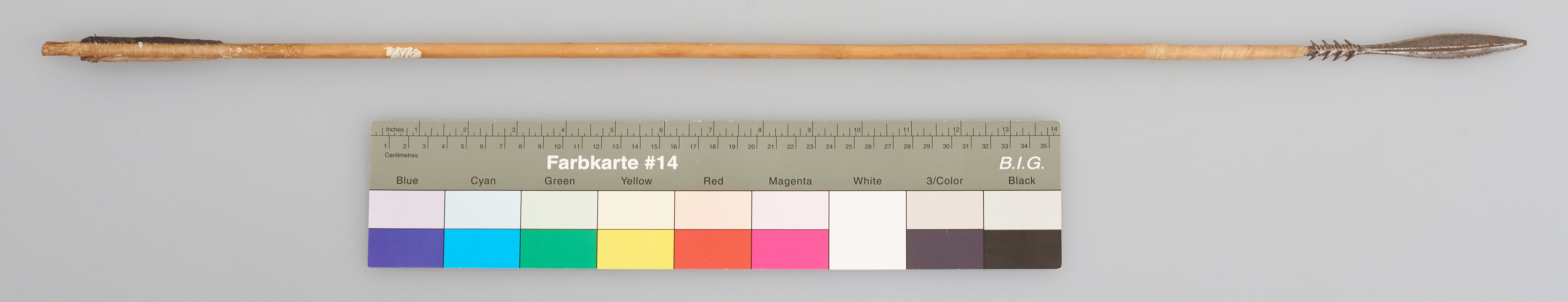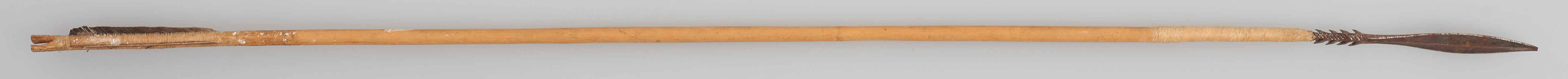 | Erweiterte Beschreibung | Pfeil mit Holzschaft, Metallspitze mit 8 Widerhaken, beschädigt, Flugsicherung. |