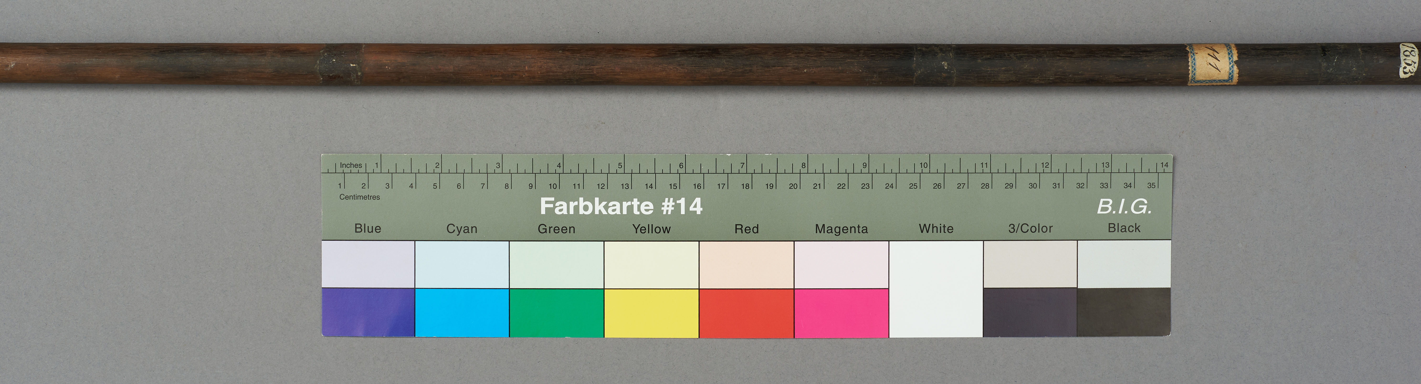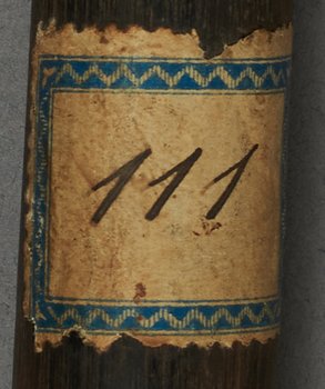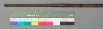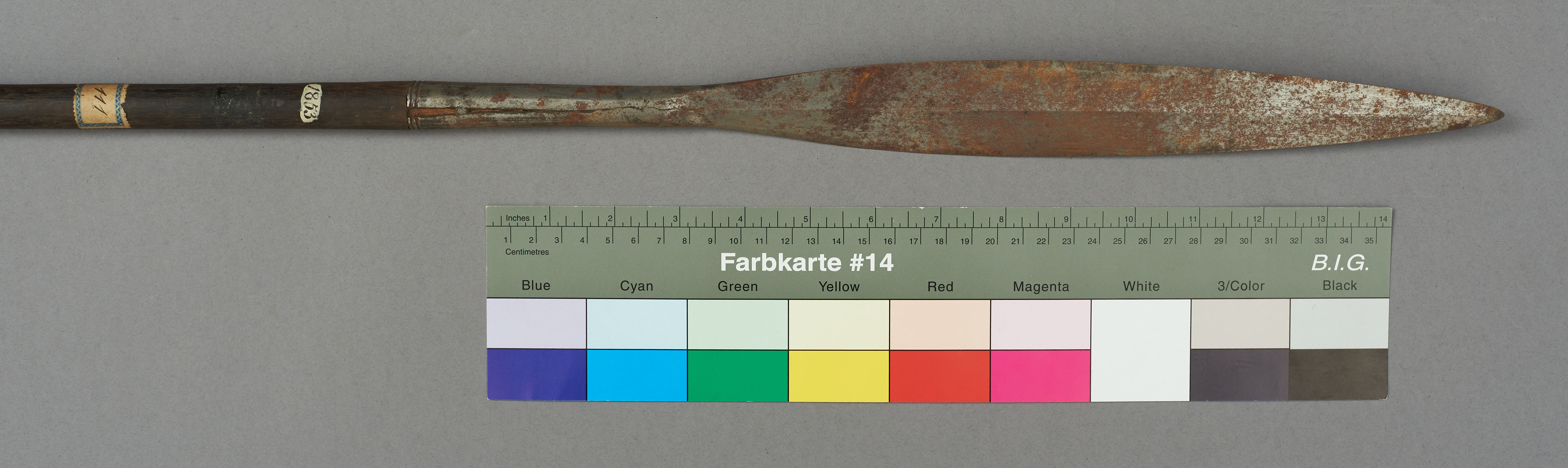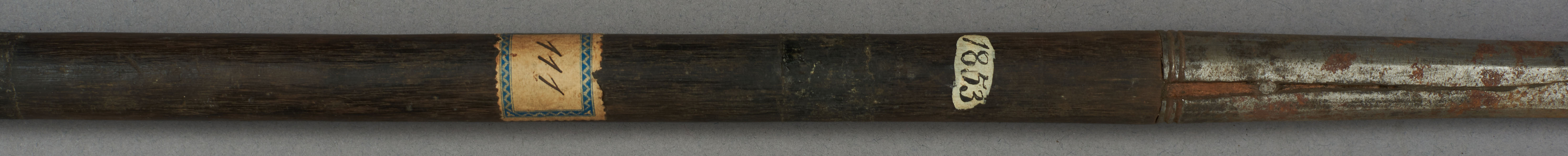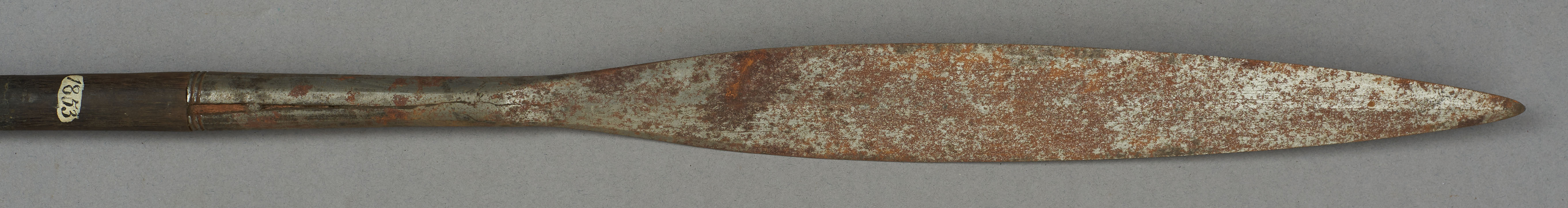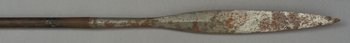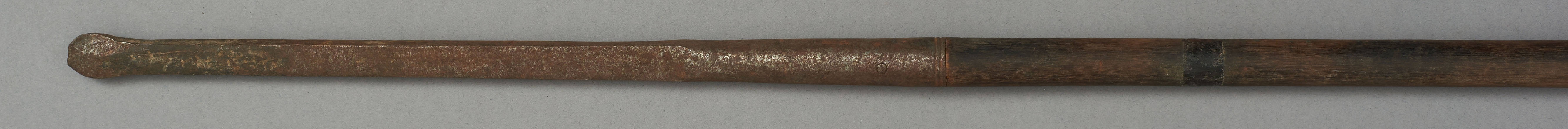 | Erweiterte Beschreibung | Speer mit kurzer blattförmiger Eisenklinge, Holzstab und eisernem Gegengewicht. |