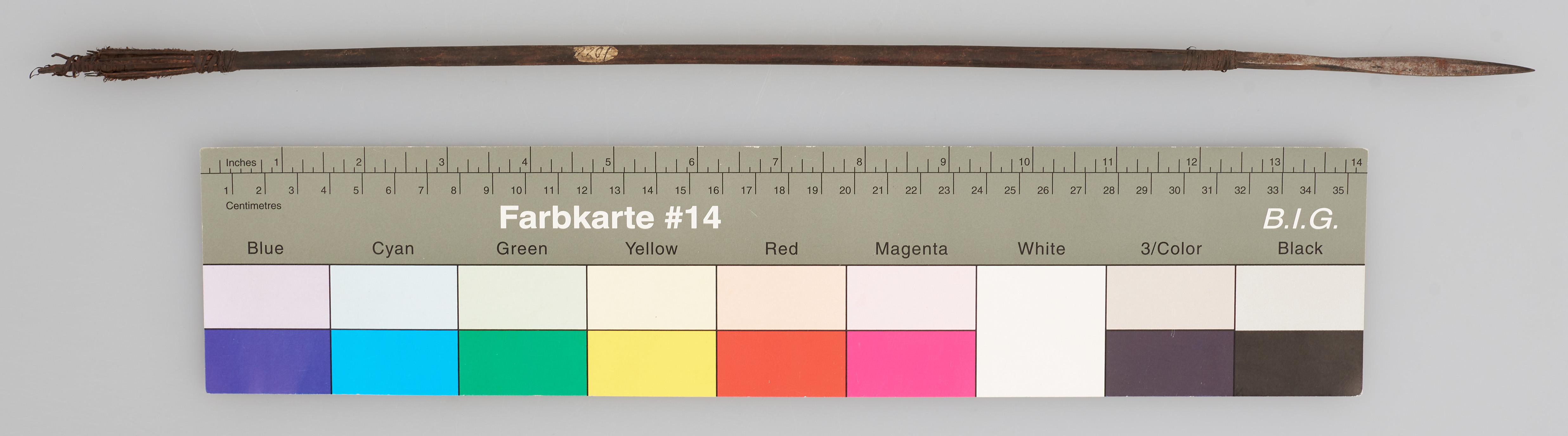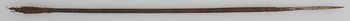 | Erweiterte Beschreibung | Pfeil mit Holzschaft und Metallspitze mit vierkantigem Stiel. Flugsicherung und Ende beschädigt. |