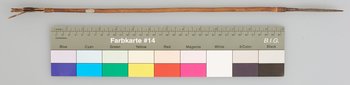 | Erweiterte Beschreibung | Kurzer Pfeil mit Holzschaft, Metallspitze und Flugsicherung, beschädigt. Ende gekerbt. |