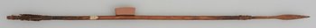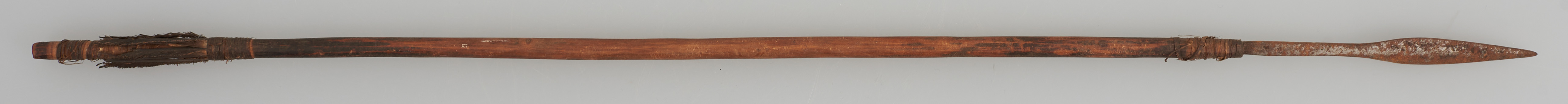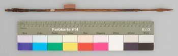 | Erweiterte Beschreibung | Pfeil mit Holzschaft, Metallspitze mit vierkantigem Stiel und Flugsicherung. Schäftung und Ende umwickelt. Ende gekerbt. |