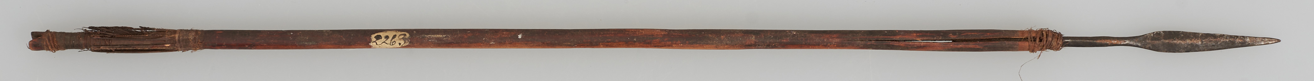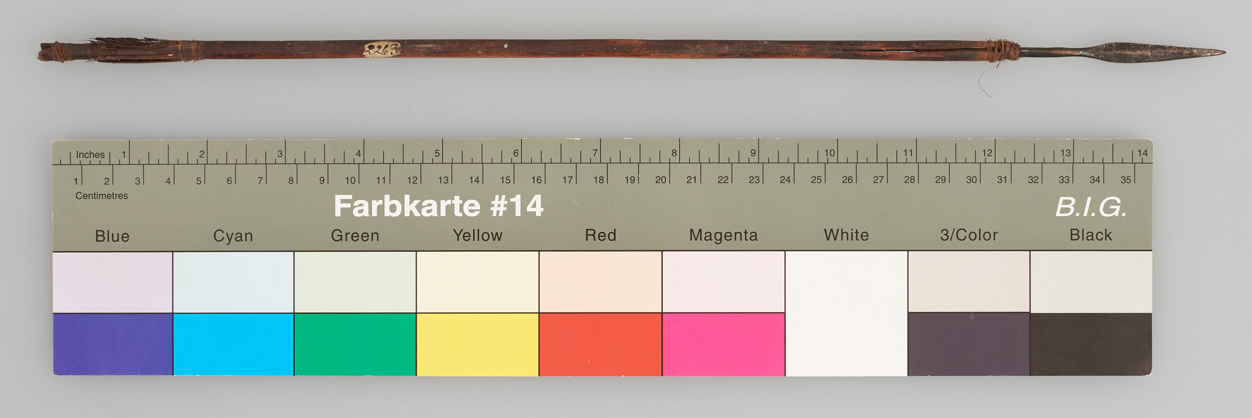 | Erweiterte Beschreibung | Pfeil mit Holzschaft, Metallspitze und Flugsicherung. Ende gekerbt. |