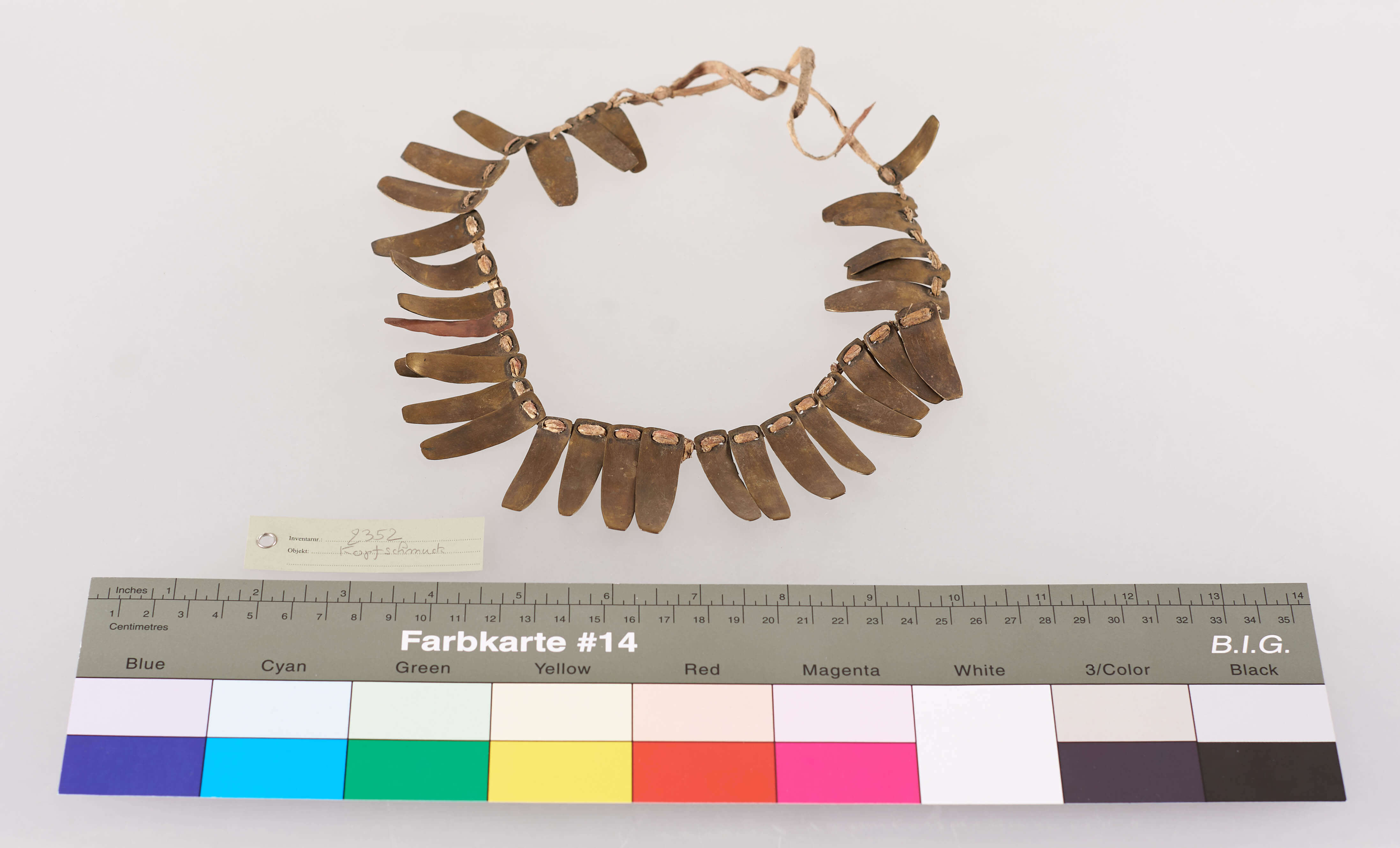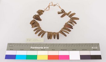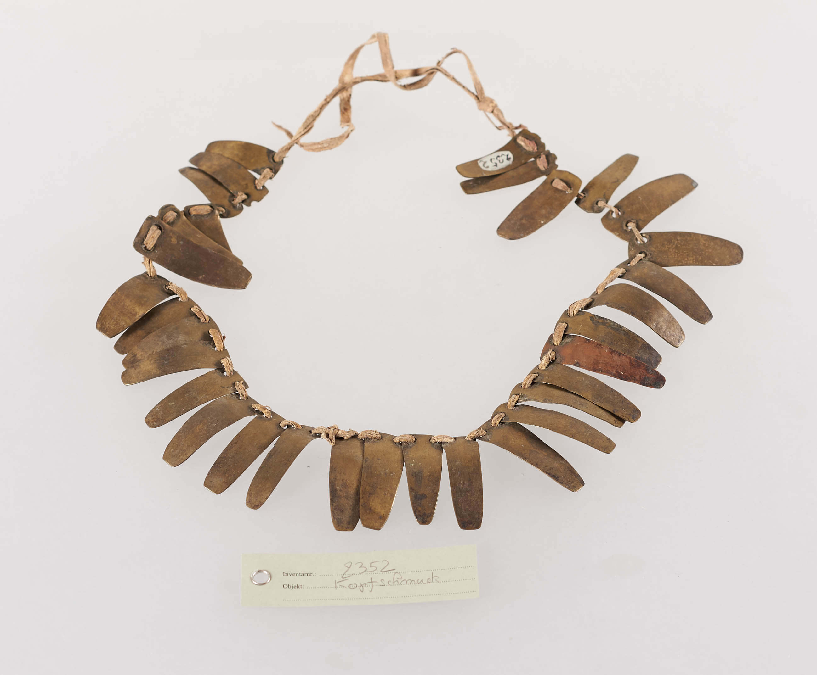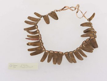 | Erweiterte Beschreibung | Gebogene Messingplättchen auf Lederriemen (sowie 1 Kupferplättchen?). Im Inventarbuch des Landesmuseum Natur und Mensch Oldenburg als "Schmuckgegenstand aus Messingplättchen, Kopfschmuck aus Ussausu" bezeichnet. |