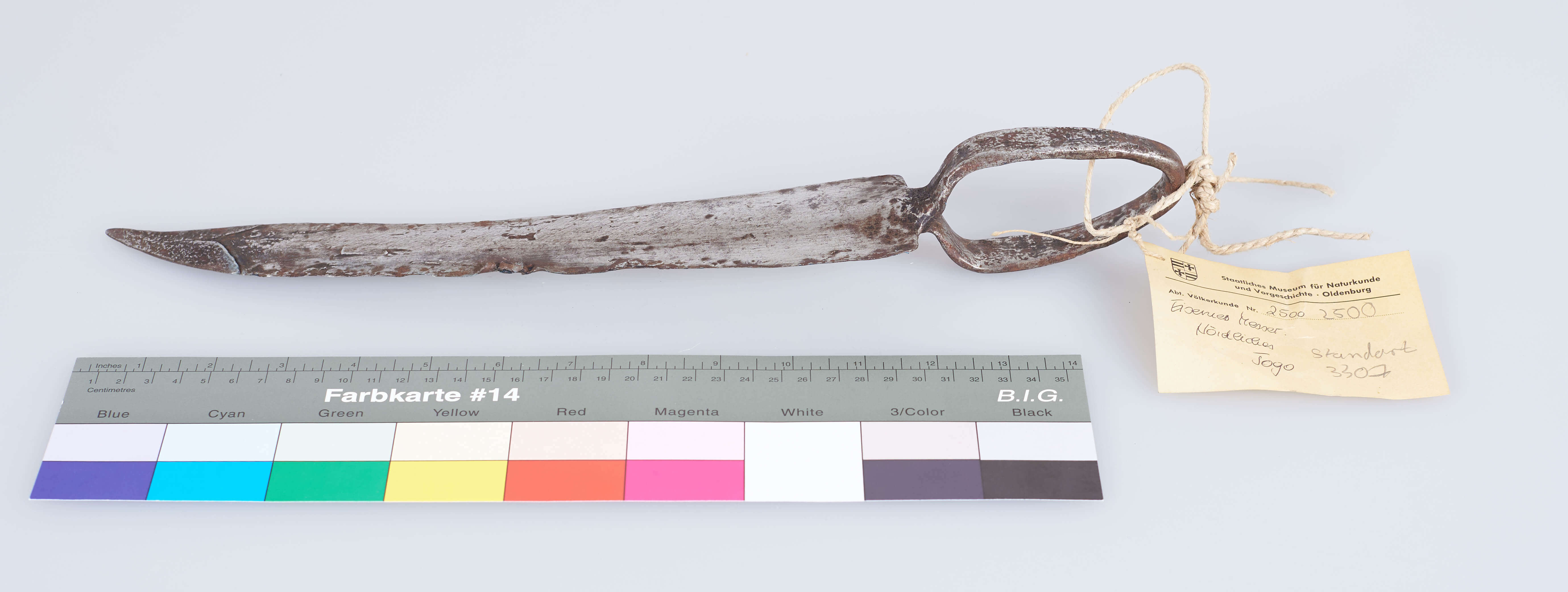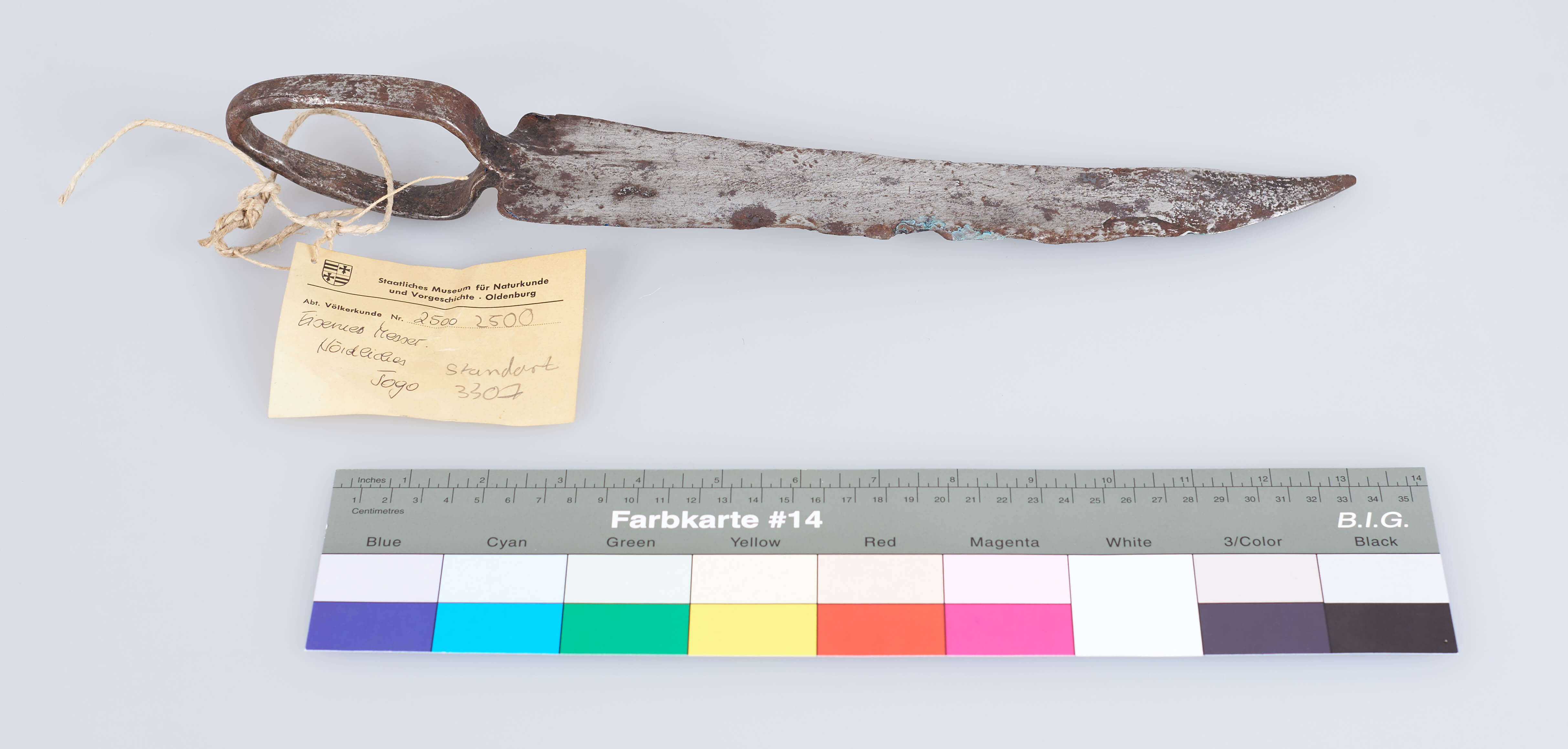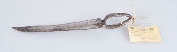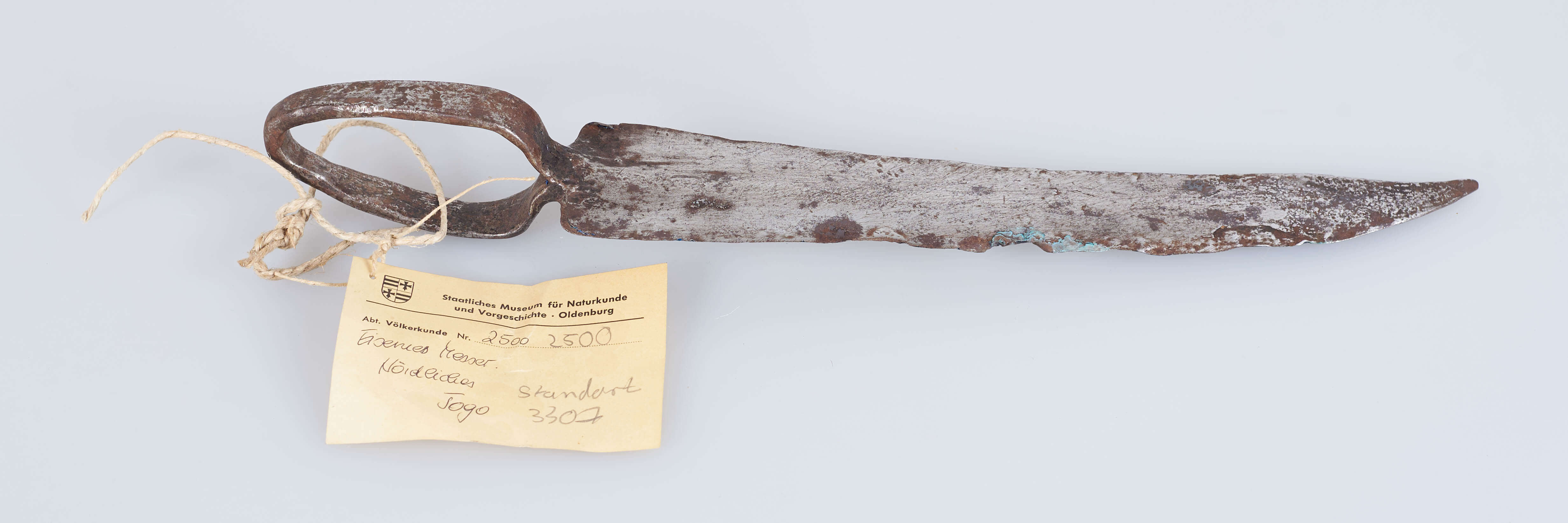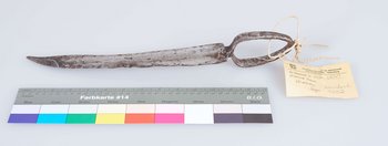 | Erweiterte Beschreibung | Das Messer ist aus einem Stück Eisen gefertigt und besitzt lediglich einen breiten Ring als Griff. Die Klinge leicht gebogen und auf ganzer Länge stark beschädigt. Es sind deutliche Spuren von Rost und Ausbesserungsversuchen zu erkennen. Erhalten vom Museum für Völkerkunde Berlin, aus der "Sammlung des Oberleutnants v. Massow, Togo". Im entsprechenden Verzeichnis wird es als "Messer mit Ringgriff", Herkunft "Nördliches Togo" bezeichnet. |
