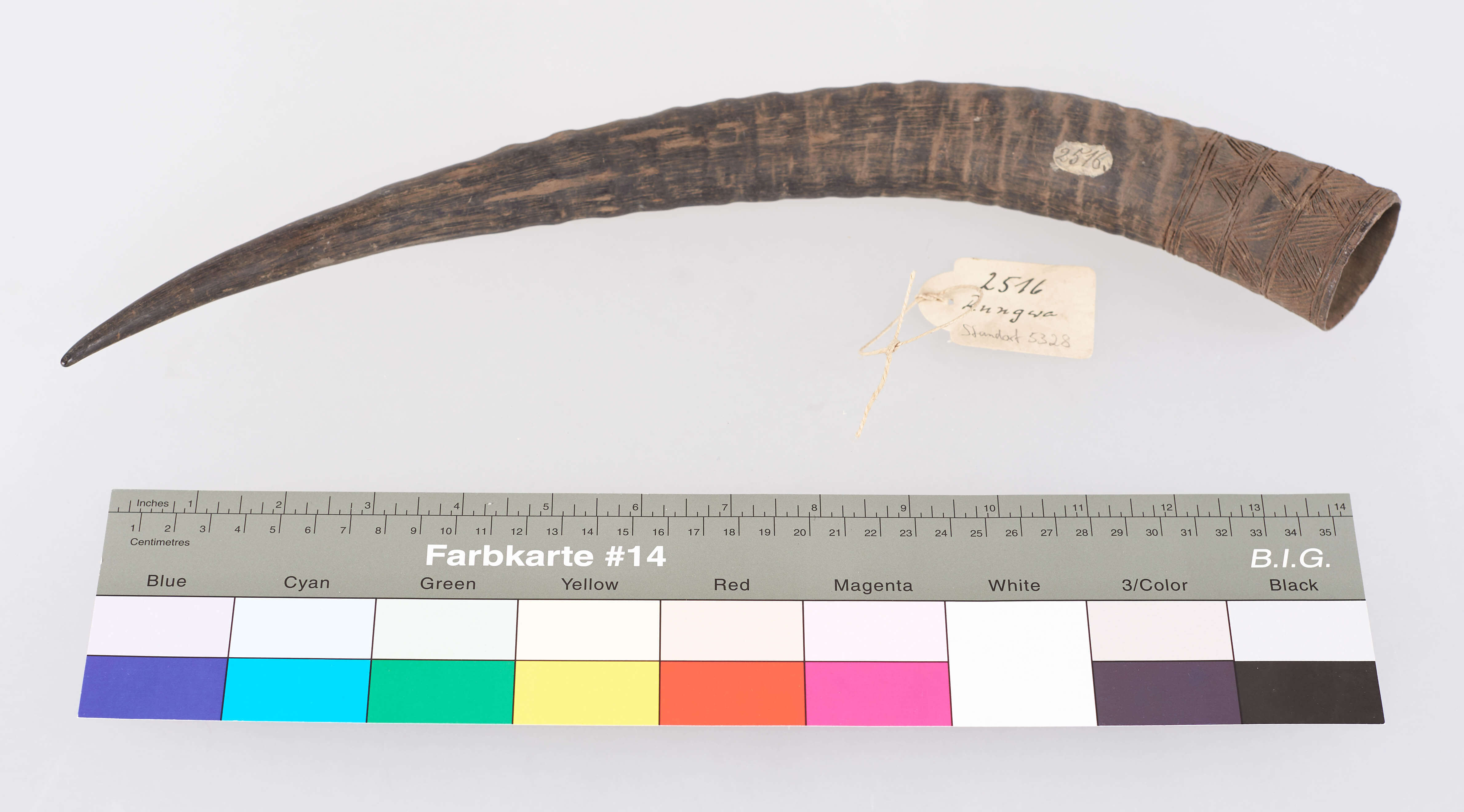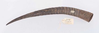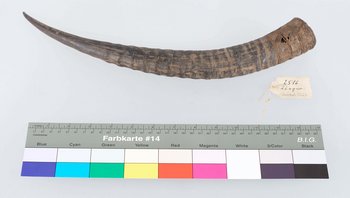 | Erweiterte Beschreibung | Horn mit Ritzverzierungen. Erhalten vom Museum für Völkerkunde Berlin, aus der "Sammlung des Leutnants Bischoff, Ostafrika". Wird in dem Verzeichnis als "unfertiges Blashorn" mit Herkunft "Rungwa" angegeben. |