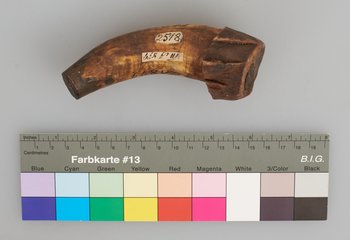 | Erweiterte Beschreibung | Horn mit Lederhaube und unbekanntem Inhalt. Erhalten vom Museum für Völkerkunde Berlin, aus der "Sammlung des Dr. Kersting, Togo". Im entsprechenden Verzeichnis wird das Objekt als "Horn mit Medizin" bezeichnet. Bei "Herkunft" ist "Tamberma" vermerkt. |