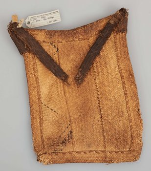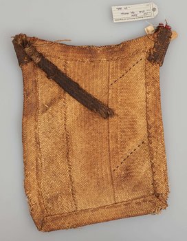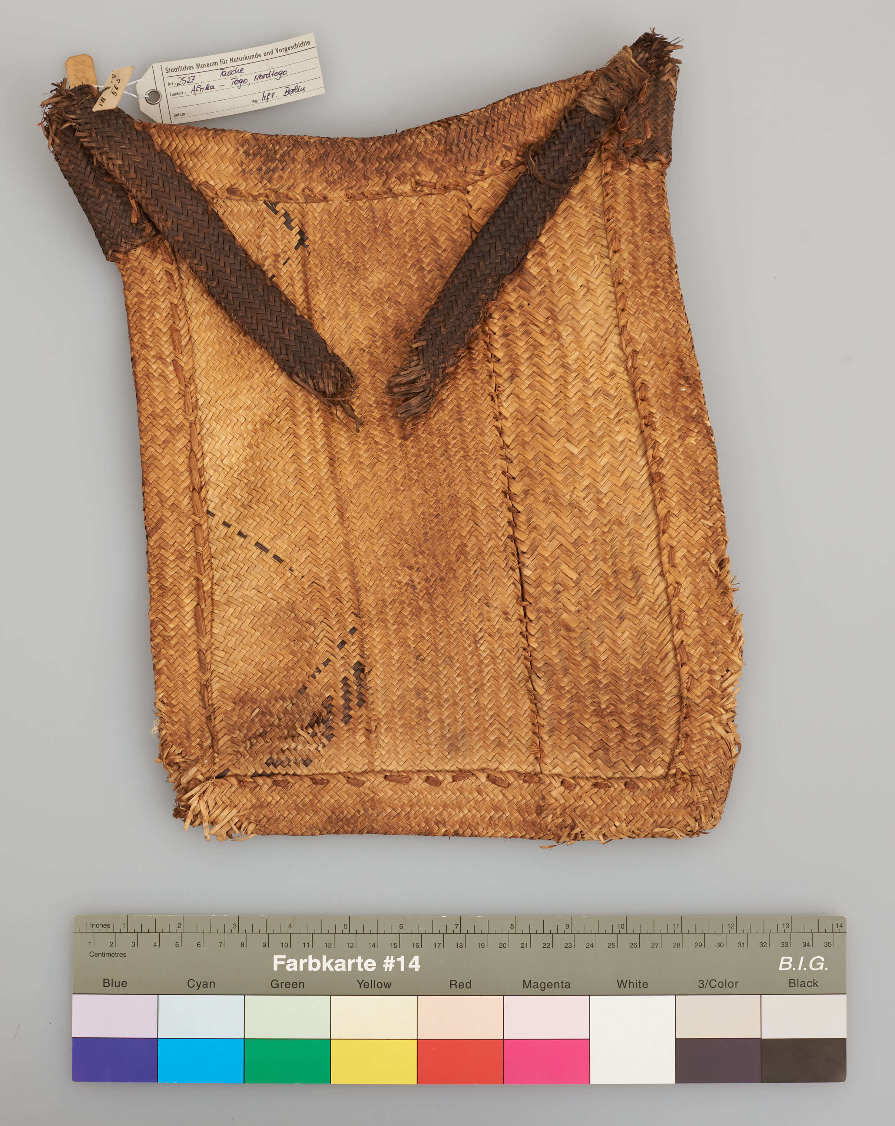 | Erweiterte Beschreibung | Geflochtene Umhängetasche. Ein dunkler Tragriemen an einer Seite ist abgerissen und nur noch als loses Fragment vorhanden. Erhalten vom Museum für Völkerkunde Berlin, aus der "Sammlung des Leutnants v. Massow, Togo". |
