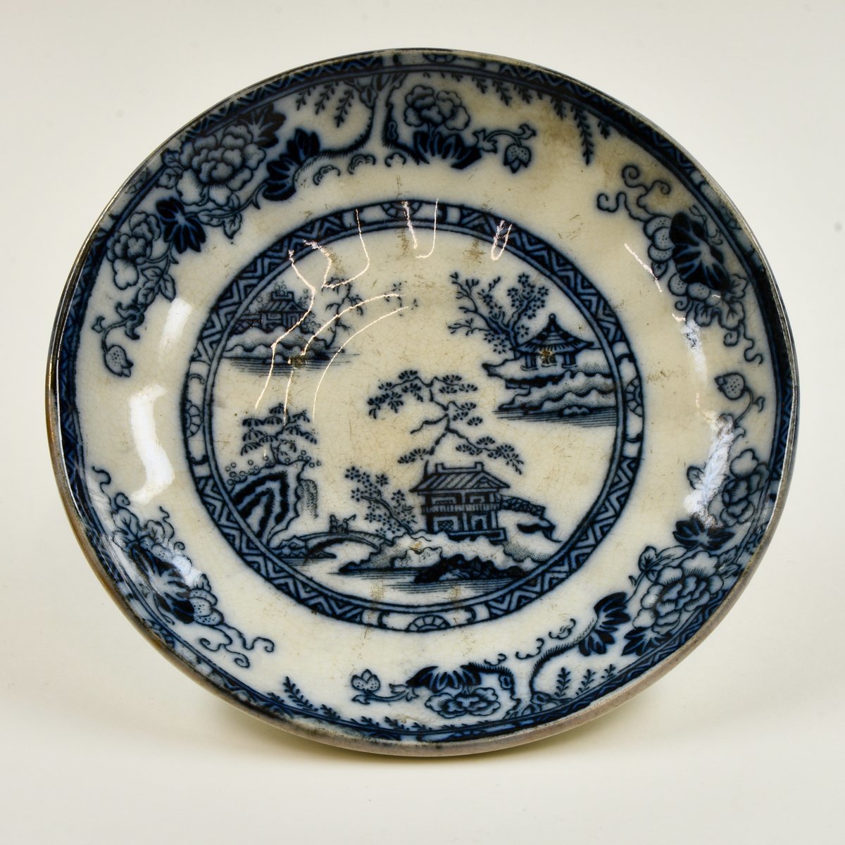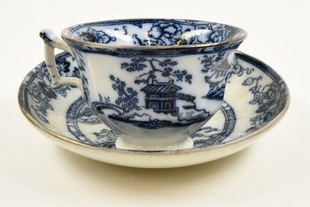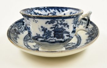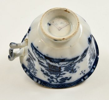 | Erweiterte Beschreibung | Tasse mit Untertasse, weiß glasiert, Tasse außen und Rand innen sowie UT oben blau bemalt mit Pflanzen und chinesischen Landschaftsmotiven, unterseitig blaue Marke "HONGKONG". |