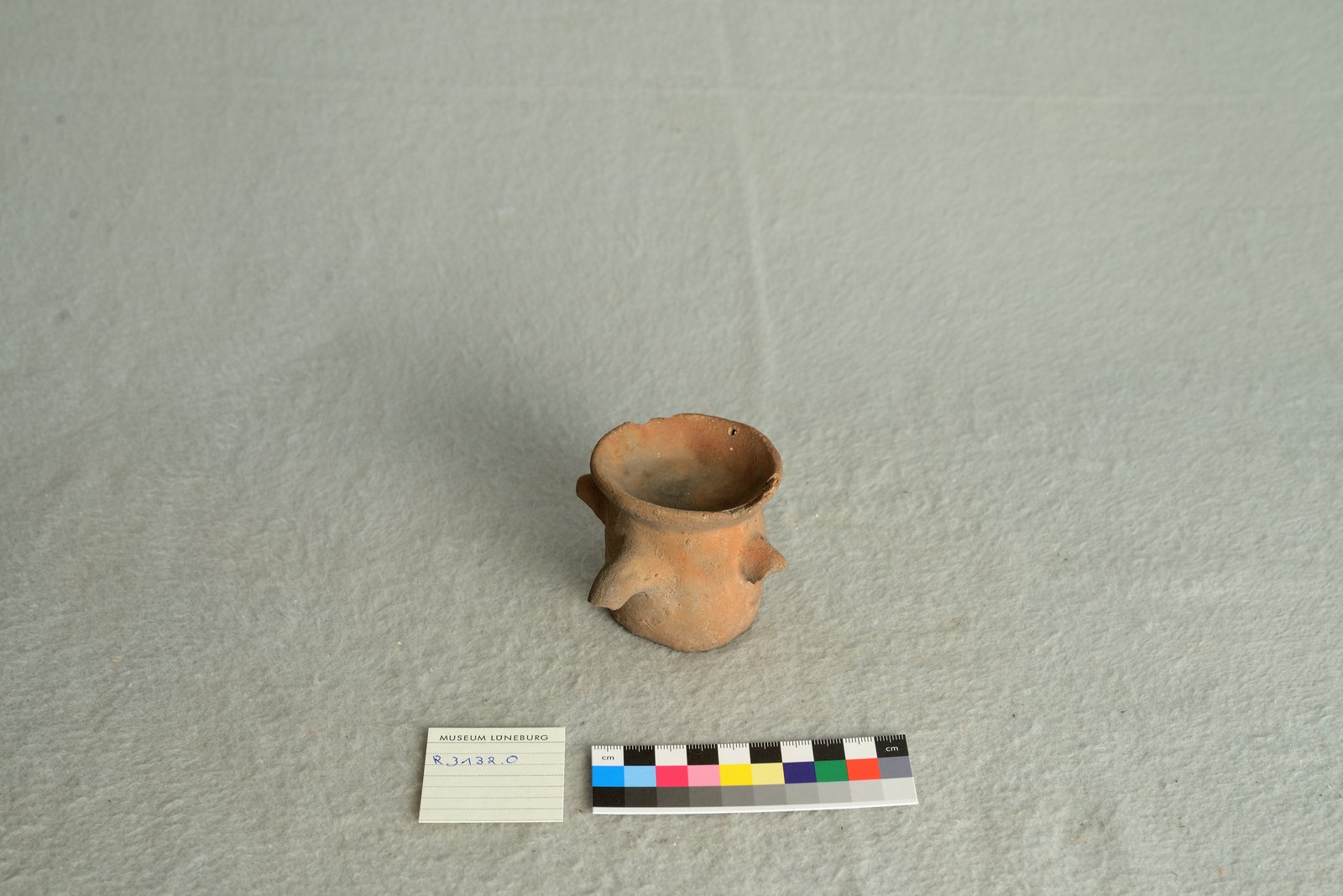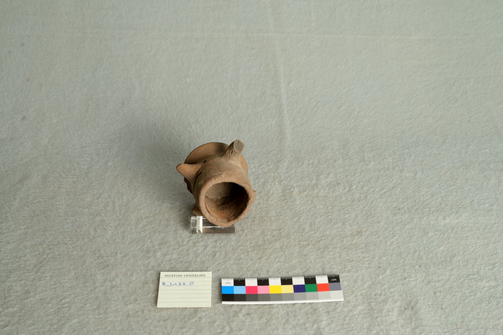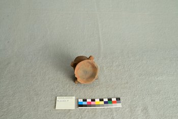 | Erweiterte Beschreibung | Tonfigur mit Nase, Mund, Augen (kleine Löcher), Kopf. Drei abgebrochene Stellen, die Henkel gewesen sein könnten. Unten offen. |