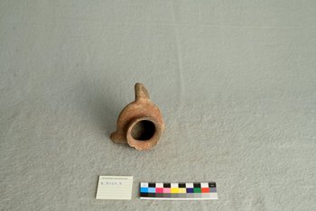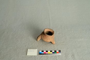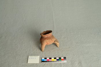 | Erweiterte Beschreibung | Gefäß aus rötlichem Ton, drei Füße, an Öffnung abgebrochene Stellen. |