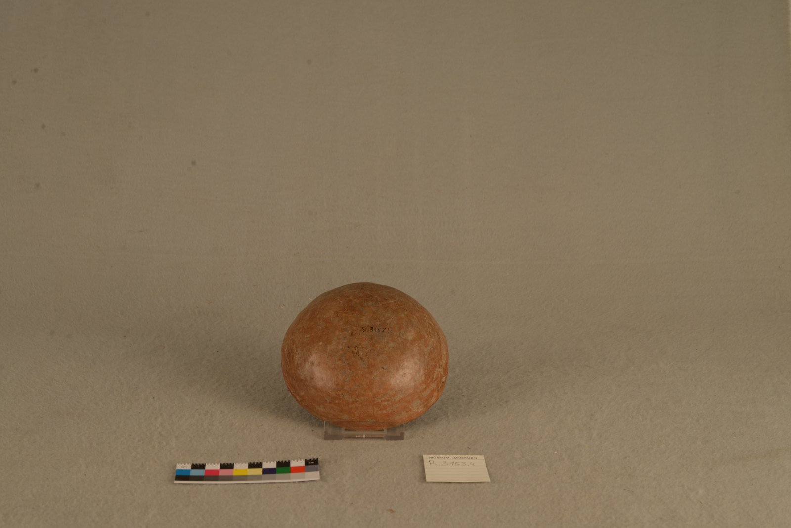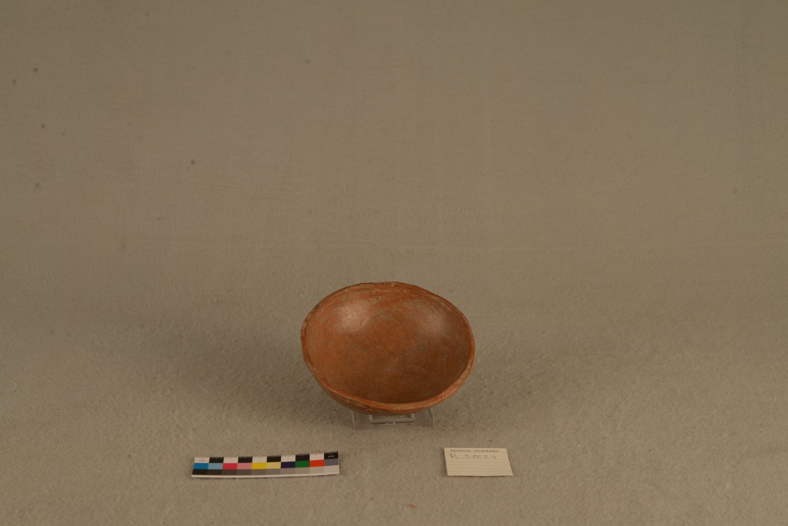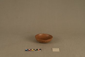 | Erweiterte Beschreibung | Kleine rot-braune Tonschale, glatte Oberfläche, fleckig, dünner Riss quer durch Schale. |