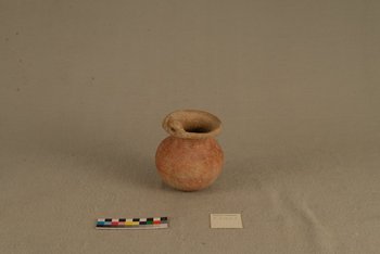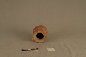 | Erweiterte Beschreibung | Tongefäß mit Henkel in Frosch- oder Schlangenkopfform. Braun-rot, auffällige graue Stelle unten seitlich. |