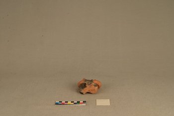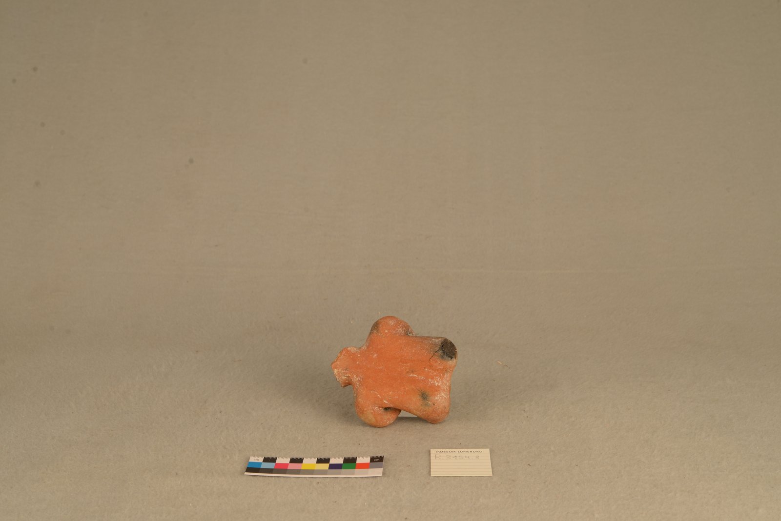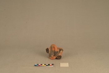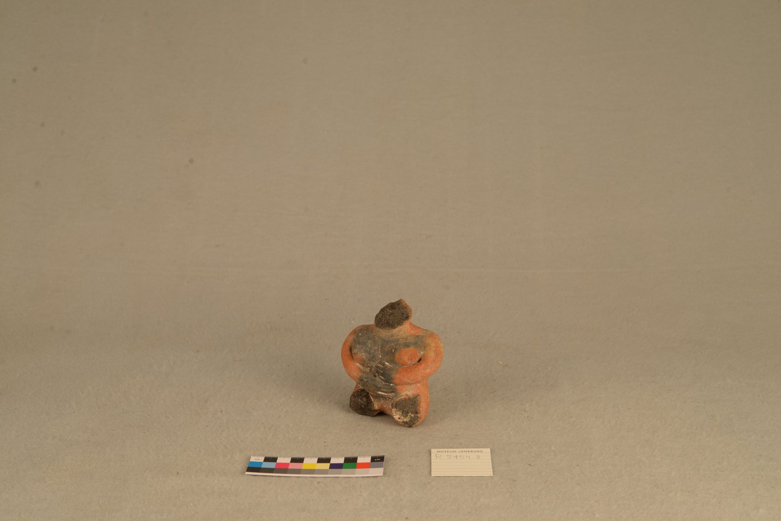 | Erweiterte Beschreibung | Rötliche weibliche Tonfigur. Kopf und Beine abgebrochen und fehlend. Vorderseite der Skulptur grau. Beide Hände auf den Bauch gelegt. |