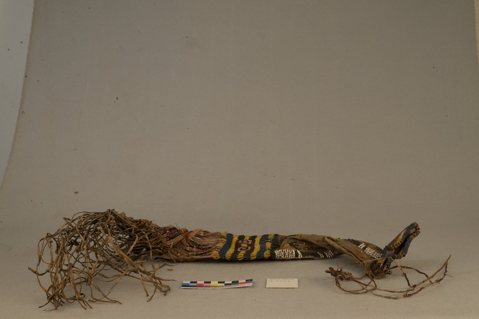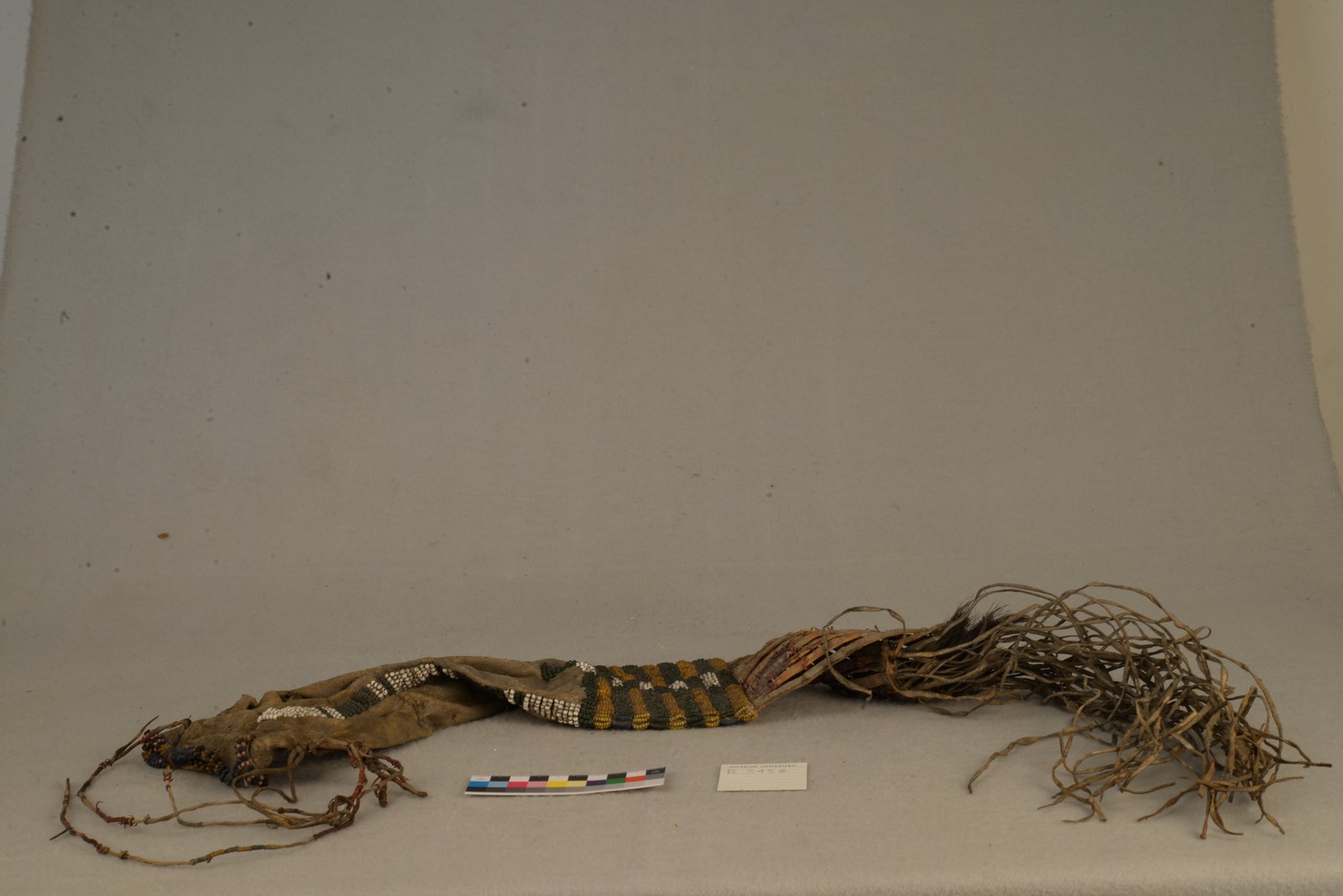 | Erweiterte Beschreibung | Länglicher mit Fransen und Perlen verzierter Beutel aus hellbraunem Leder. |