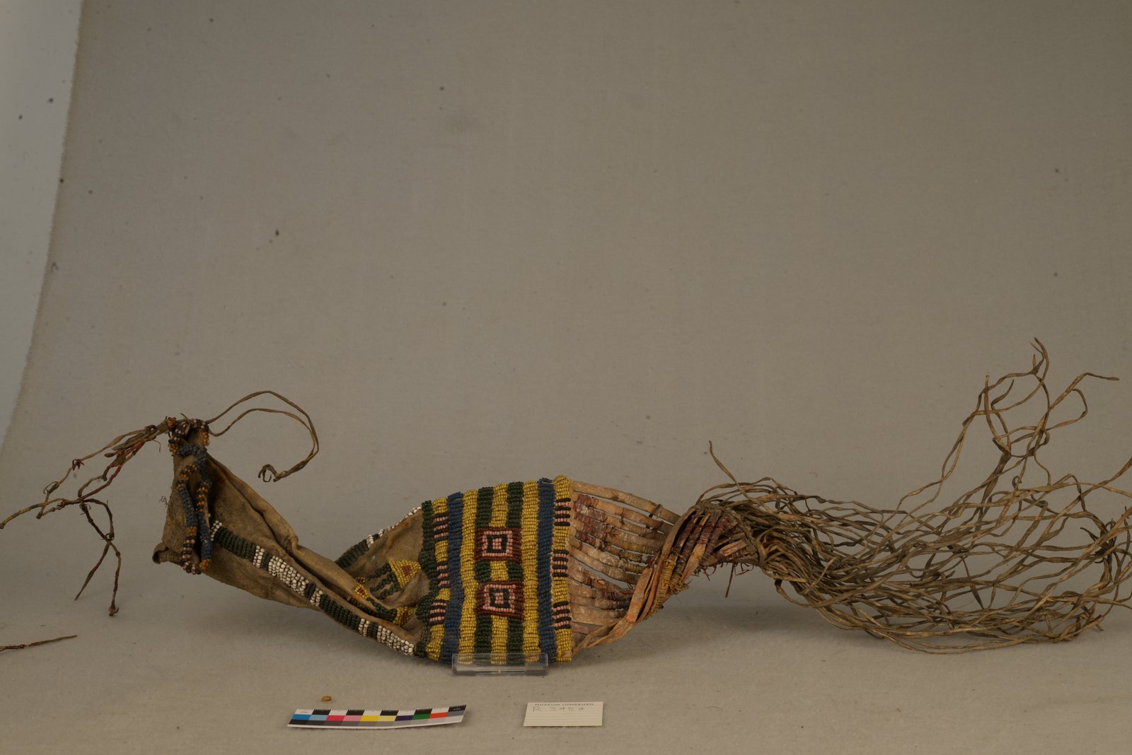 Der Pfeifenbeutel stammt vermutlich Aus dem nordamerikanischen Kulturareal der „Prärien und Plains“ (Arapaho?) und wurde im späten 19. Jahrhundert hergestellt.