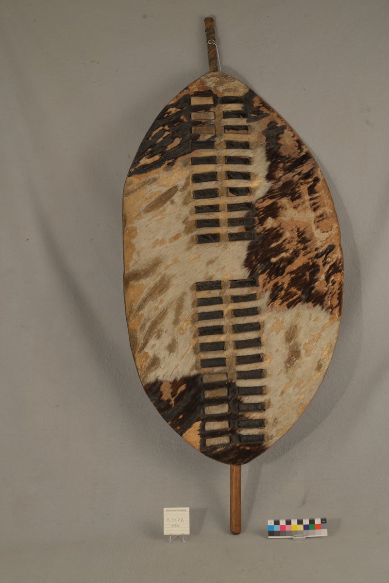 Der Schild stammt wahrscheinlich aus der Sammlung des Weinhändlers Hans Knop und kam 1880 ins Museum. Er lässt sich den Zulu zuordnen. Im British Museum gibt es einen vergleichbaren Schild (Af,+.1431), der während des englischen „Zulu-Krieges“ 1879 auf dem Schlachtfeld von Ulundi eingesammelt wurde. Das Lüneburger Objekt hat vermutlich einen ähnlichen Ursprung. Albert Behrens hielt den Schild wegen seiner geringen größe für einen Spiel- oder Tanzschild. Das Londoner Exemplar zeigt, dass auch eine kriegerische Nutzung möglich ist.