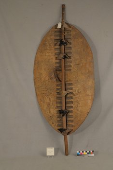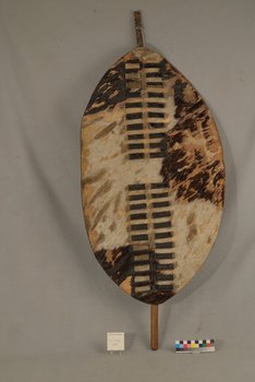 | Erweiterte Beschreibung | Lederschild mit eingewobenen Streifen und Holzstab. Nutzungsspuren, insbesondere am Griff. |